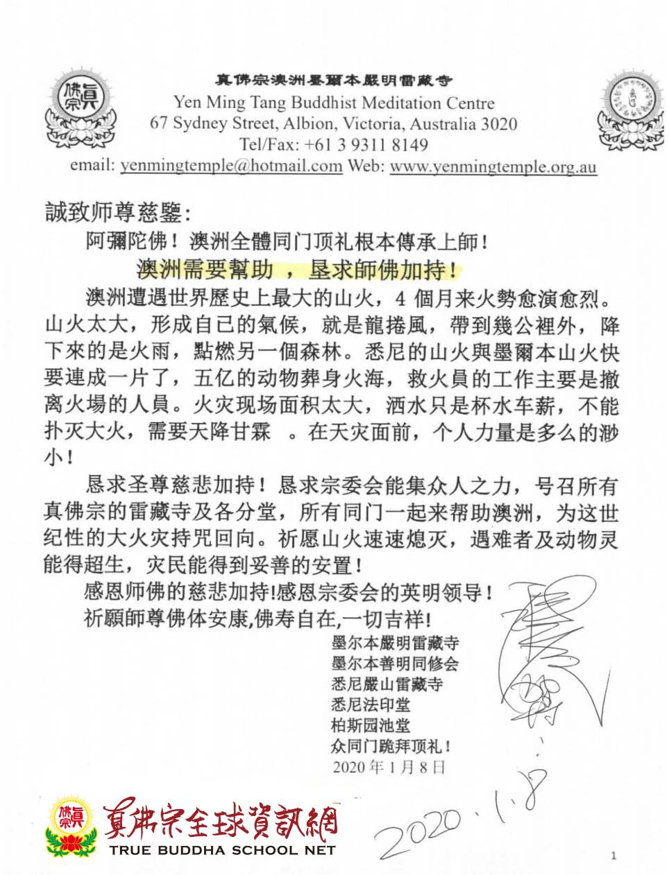 為此,世界真佛宗宗務委員會發起全球真佛弟子共持「大救難咒」活動,集眾人之力,同共發大慈悲心,祈願迴向已然成為煉獄的火場能夠盡早停息,使往日動物們的快樂天堂再現,澳洲嚴重受創的經濟與環境也能速速恢復;更祈願仰仗不可思議的咒力與佛力,接引因惡火而逝去的生命,往生善處。