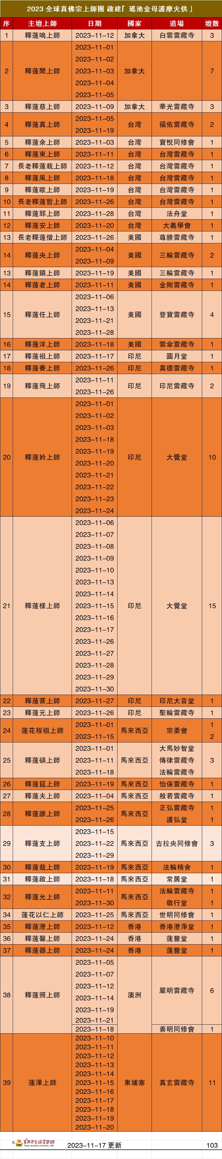 目前共有39位上師啟建103壇瑤池金母護摩火供迴向 師佛, 而登記將於11月25-26日舉辦瑤池金母薈供法會的真佛宗道場共有大約84個道場,合共84壇。