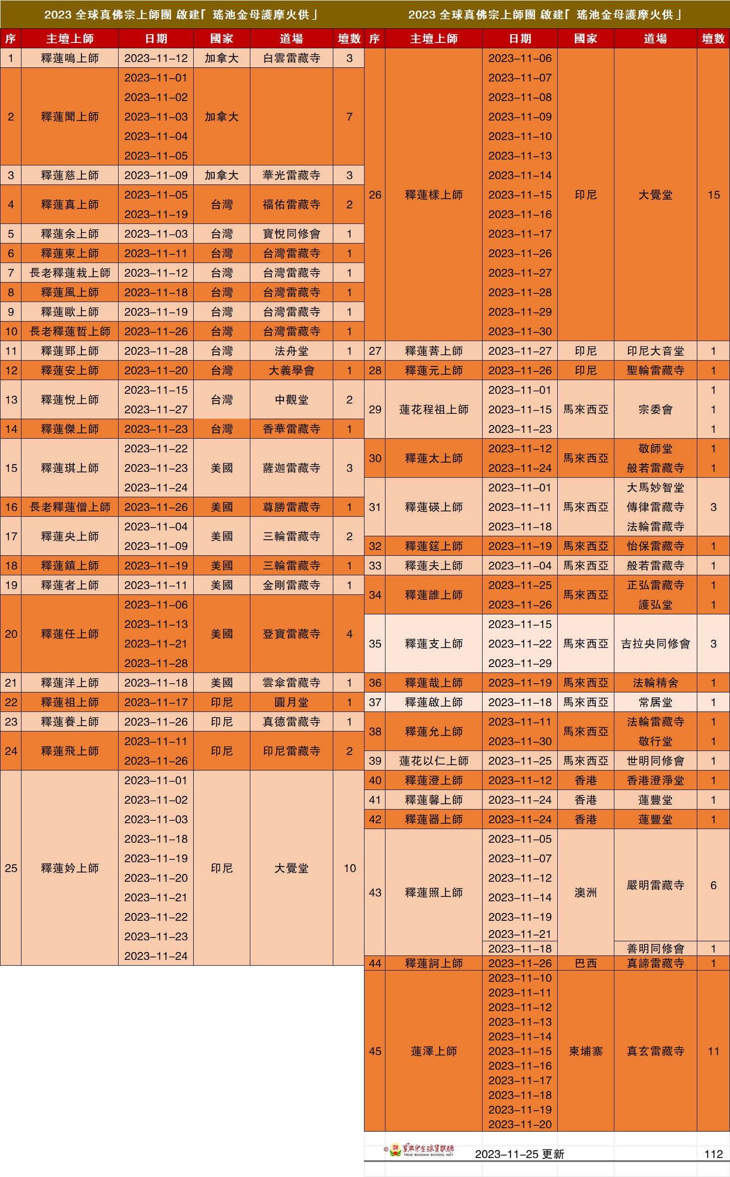 目前共有45位上師啟建112壇瑤池金母護摩火供迴向 師佛, 而登記將於11月25-26日舉辦瑤池金母薈供法會的真佛宗道場共有大約109個道場,合共109壇。
