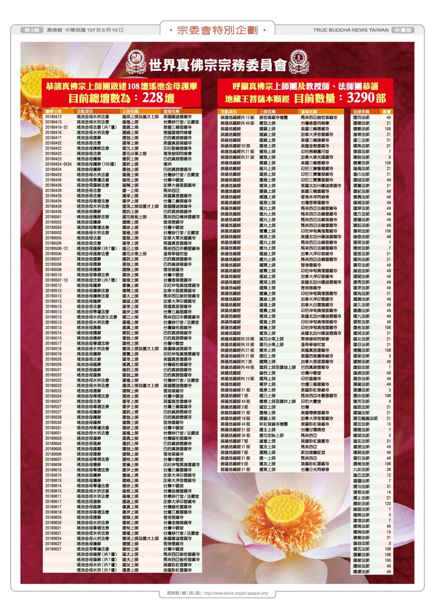 在第一波為「羅天大醮」啟建法會及誦經的回向中,我們看到真佛宗上師團,在世界各地主壇「瑤池金母法會」 回向,已達228壇,、法師團恭誦「地藏經」回向,所集結的遍數,更高達3290部,還有真佛經、高王經,各種經咒都共同在轉動著法輪。