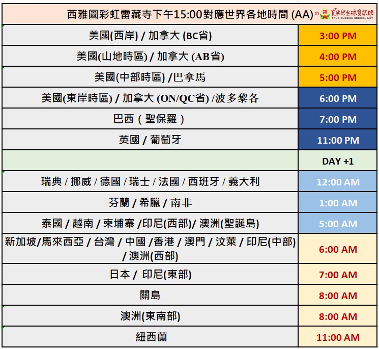 溫馨提醒:紐西蘭調時,西雅圖雷藏寺和彩虹雷藏寺同修法會世界對照時間表已更改