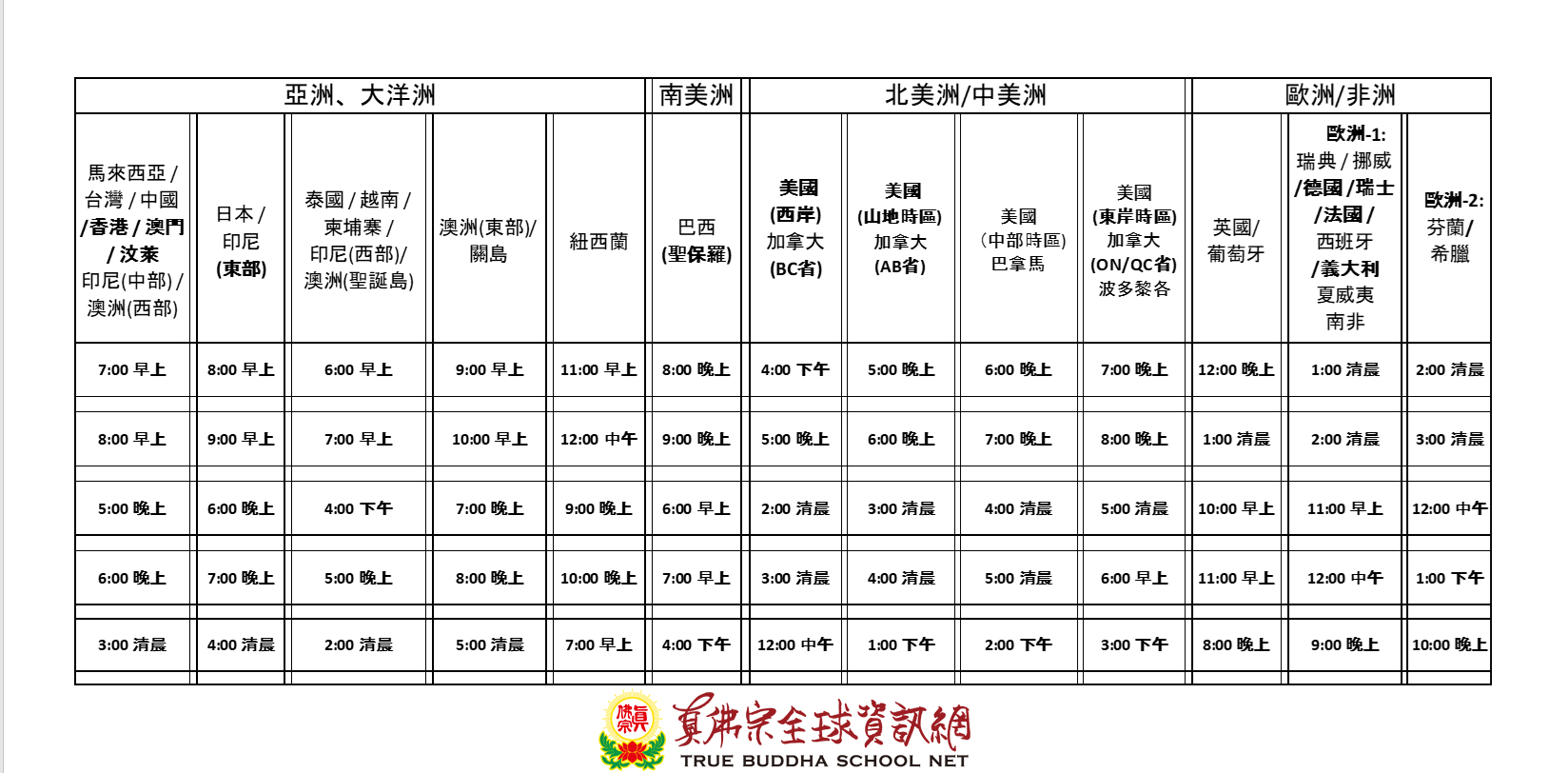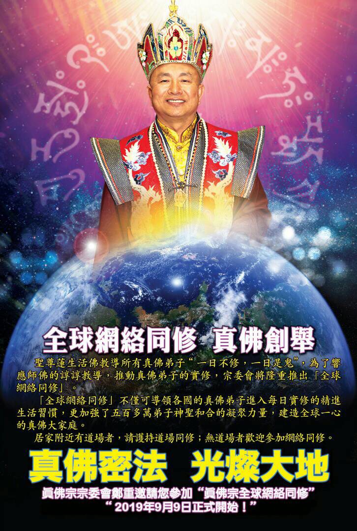 為了響應師尊的諄諄教導,推動真佛弟子的每日精進實修,宗委會將於2019年9月9日起,隆重推出「真佛宗全球網路同修」,每星期一到星期五,每天五個時段,見附表。