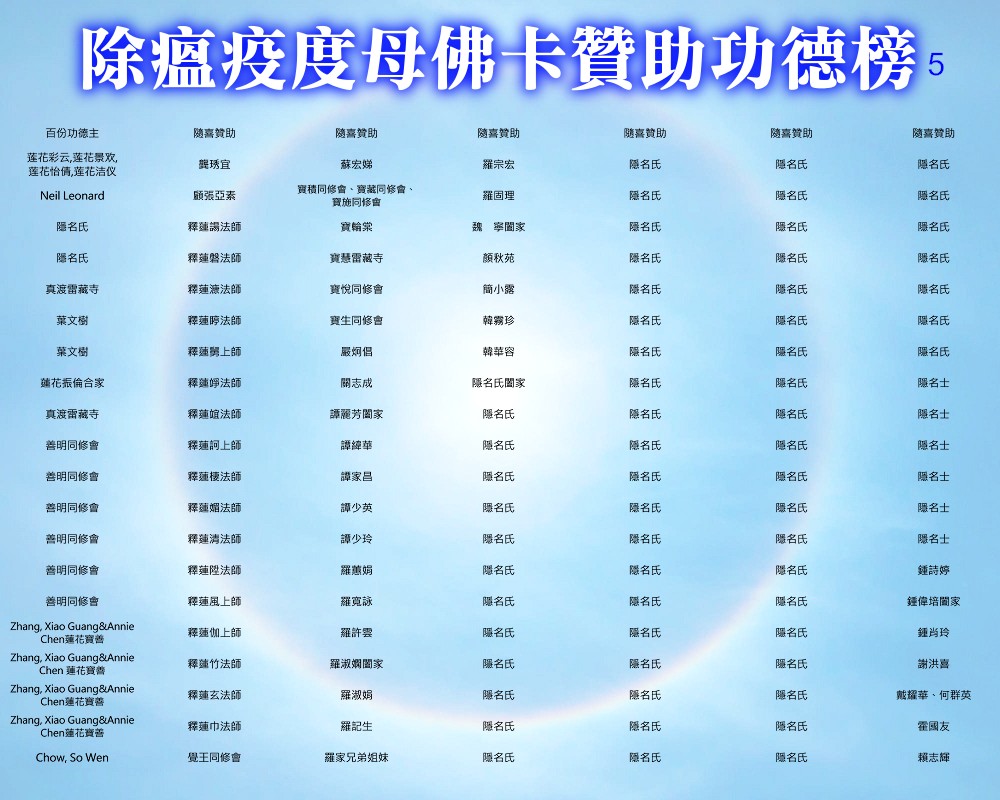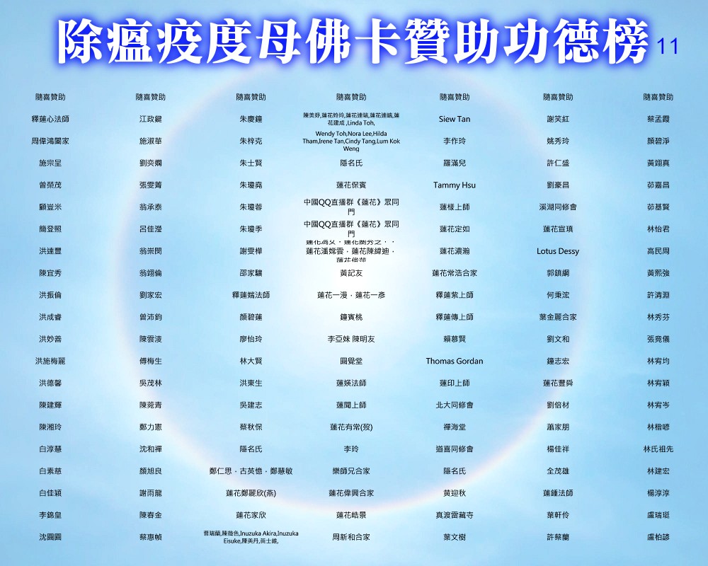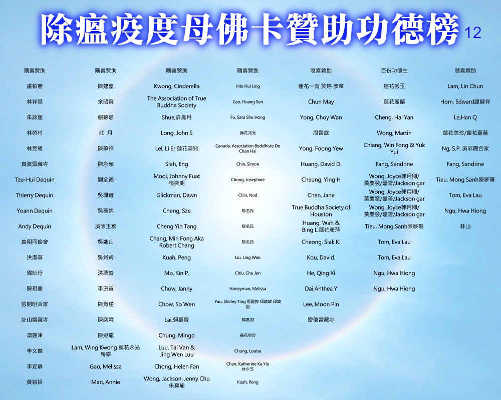【除瘟疫度母佛卡贊助功德榜】 宗委會感恩諸位善信大德贊助印製「除瘟疫度母」佛卡! 在人心惶惶的疫情中,經由真佛宗根本傳承上師加持的「除瘟疫度母」佛卡令人倍增信心,卡中的「避疫病符」令人安心。持誦除瘟疫度母心咒或修除瘟疫度母念誦法時,法相更有助於觀想。 一張佛卡不僅是一張佛卡,祂既充滿了傳承加持力,充滿了師佛對弟子的疼惜和關懷,也滿載著功德主們的愛心。 宗委會再次對眾功德主表達衷心的感謝!功德無量!利益眾生! 世界真佛宗宗務委員會 合十