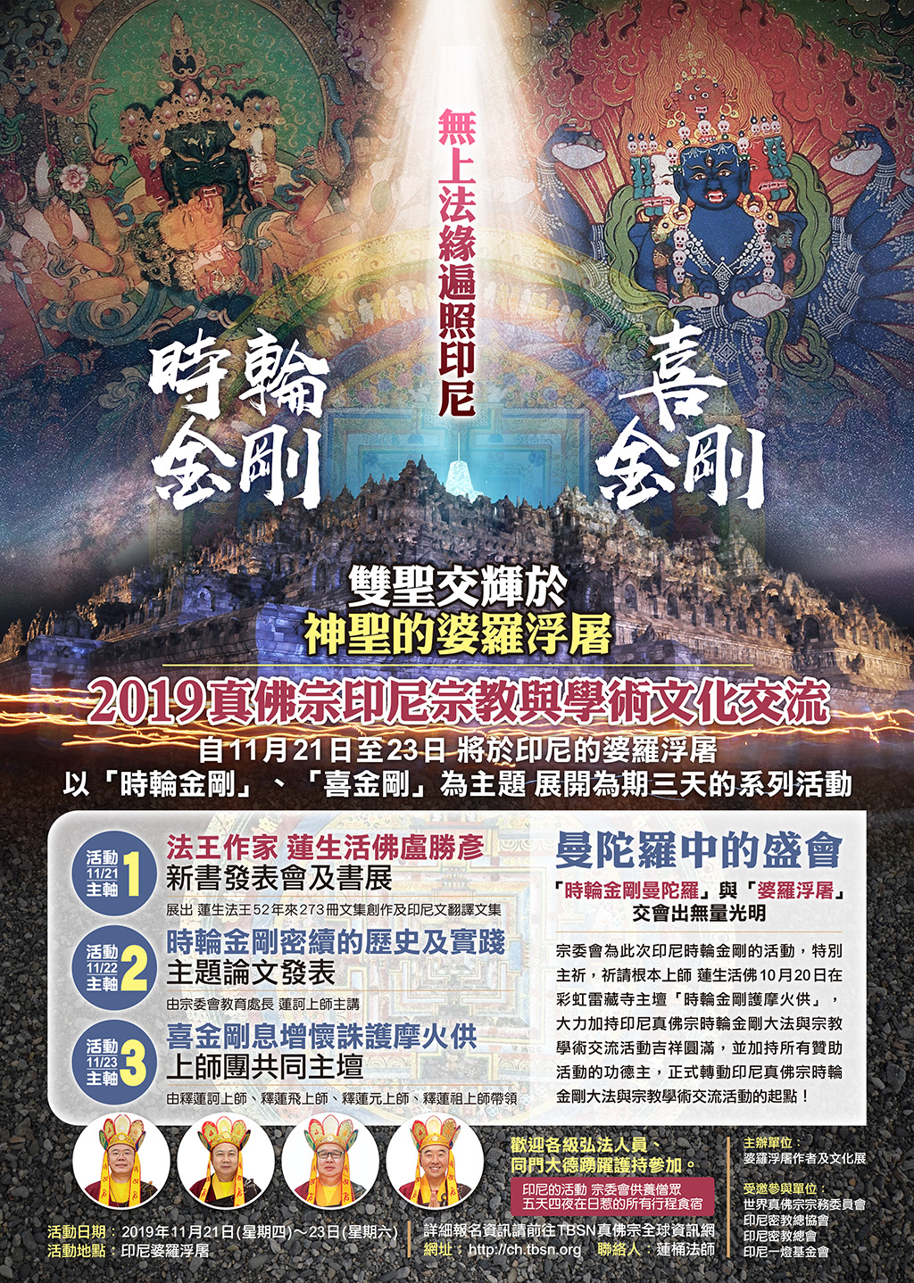 宗委會為此次印尼時輪金剛的活動,特別主祈,祈請根本上師 蓮生活佛10月20日在彩虹雷藏寺主壇「時輪金剛護摩火供」,大力加持印尼真佛宗時輪金剛大法與宗教學術交流活動吉祥圓滿,並加持所有贊助活動的功德主,正式轉動印尼真佛宗時輪金剛大法與宗教學術交流活動的起點!