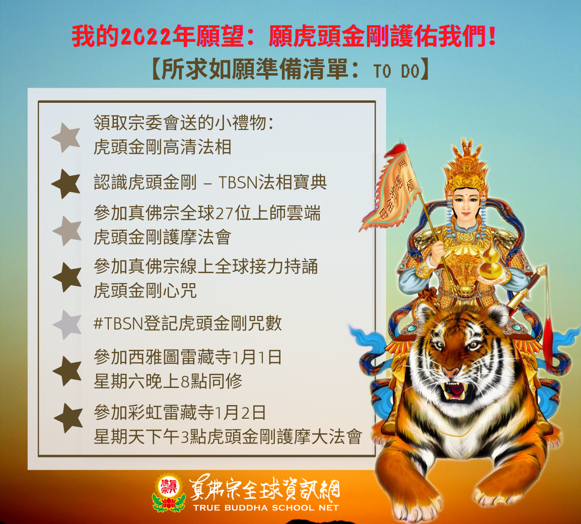 7)參加彩虹雷藏寺1月2日星期天下午3點虎頭金剛護摩大法會:聖尊蓮生法王為「2022年真佛宗為世界祈福活動」及請供「虎頭金剛吉祥物」的同門善信圓滿大加持及總迴向。