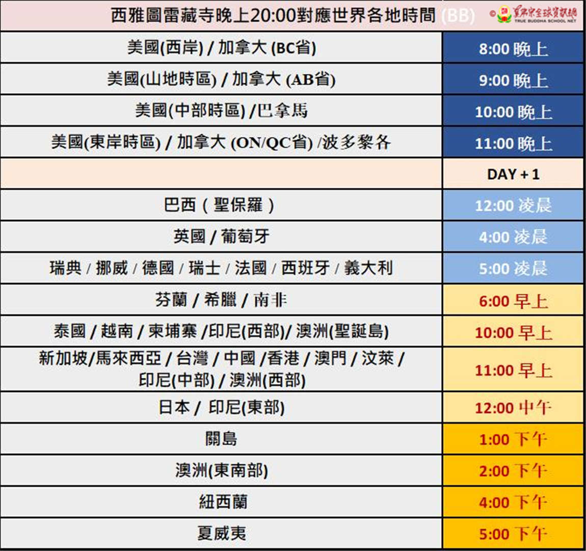 2022-10-02 #澳洲調時,西雅圖雷藏寺週六同修和彩虹雷藏寺週日護摩法會世界時間對照表更換