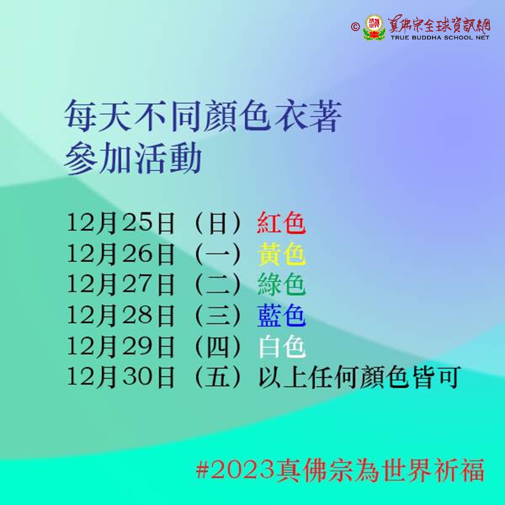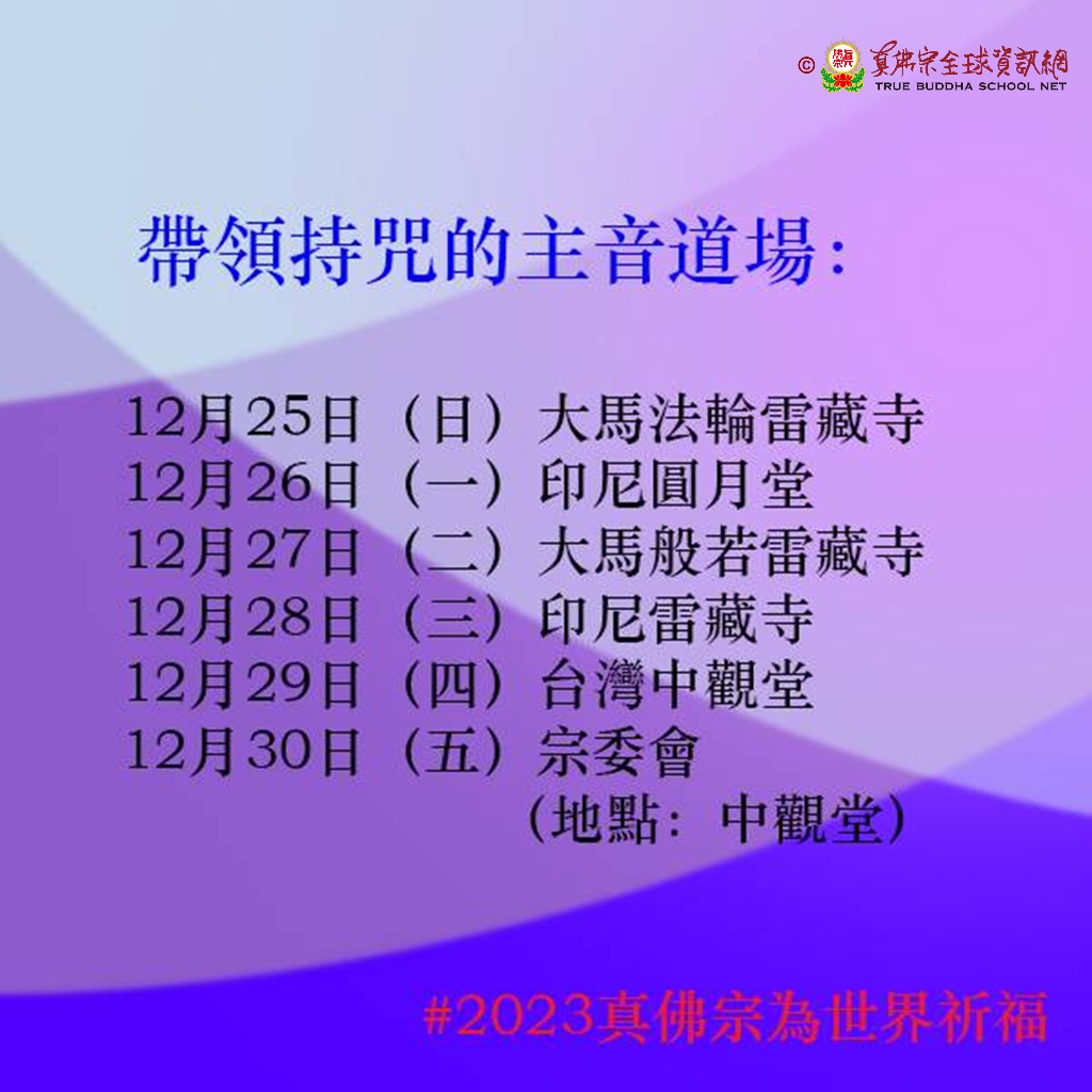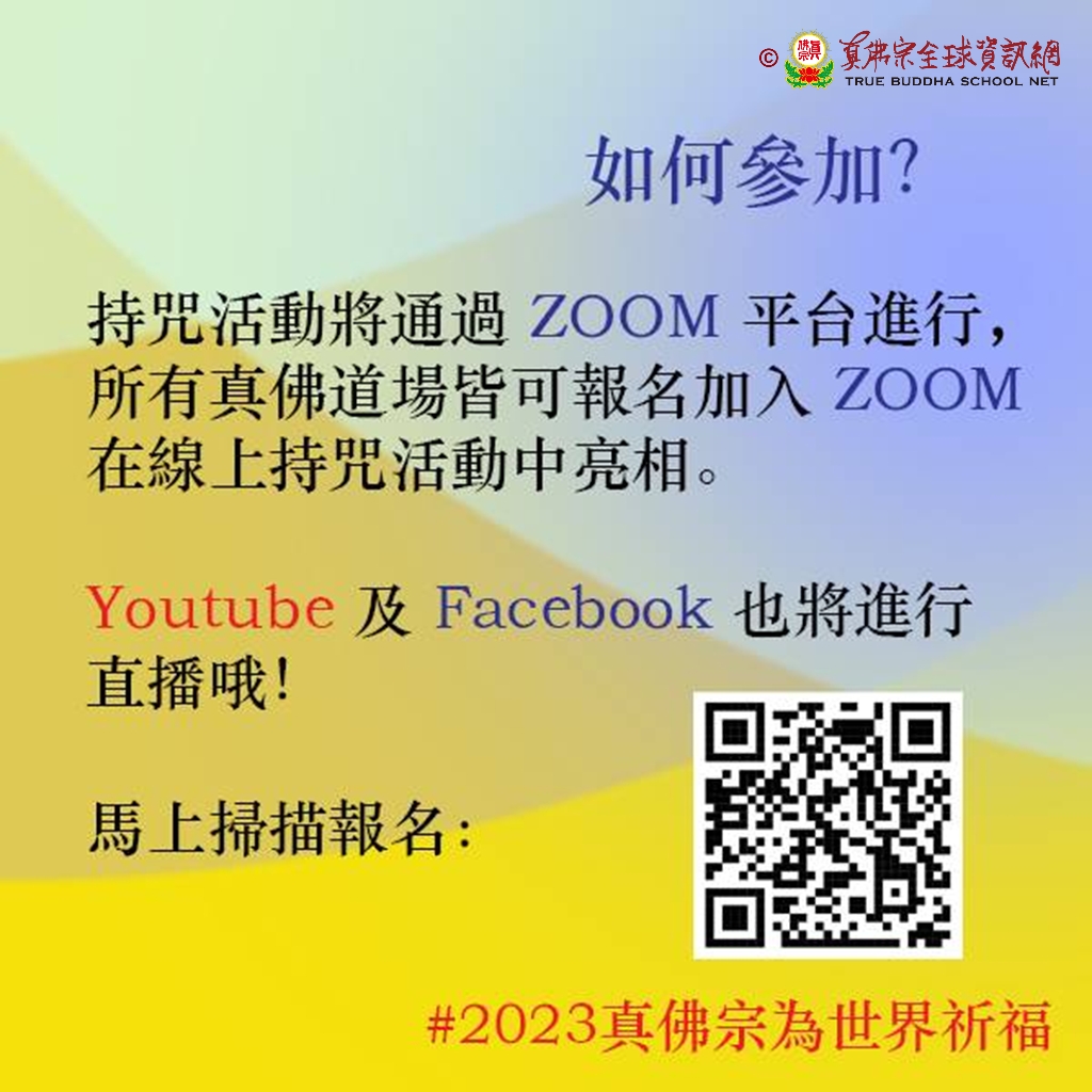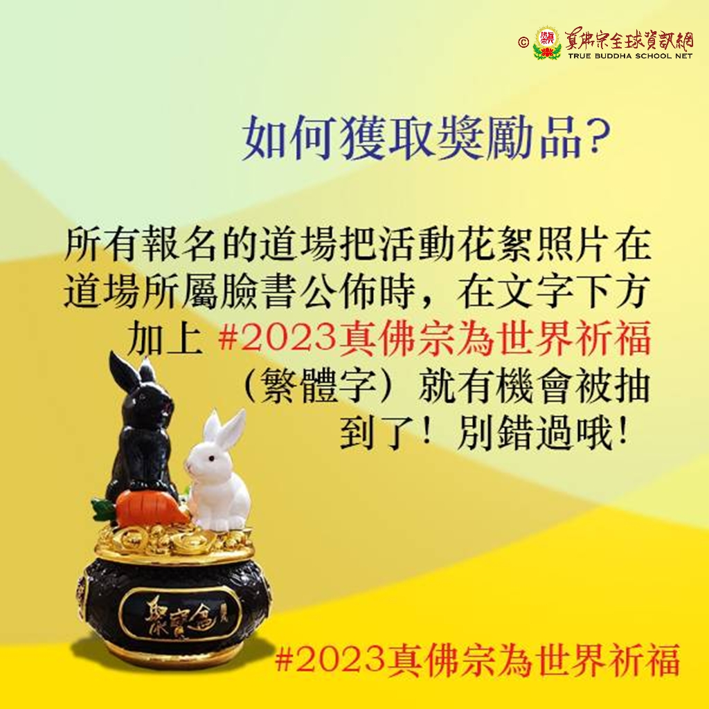 道場組:將持咒活動或點燈花絮照片或在道場持咒之花絮照片發佈在道場臉書(Facebook),並在文字內容中加上 #2023真佛宗為世界祈福