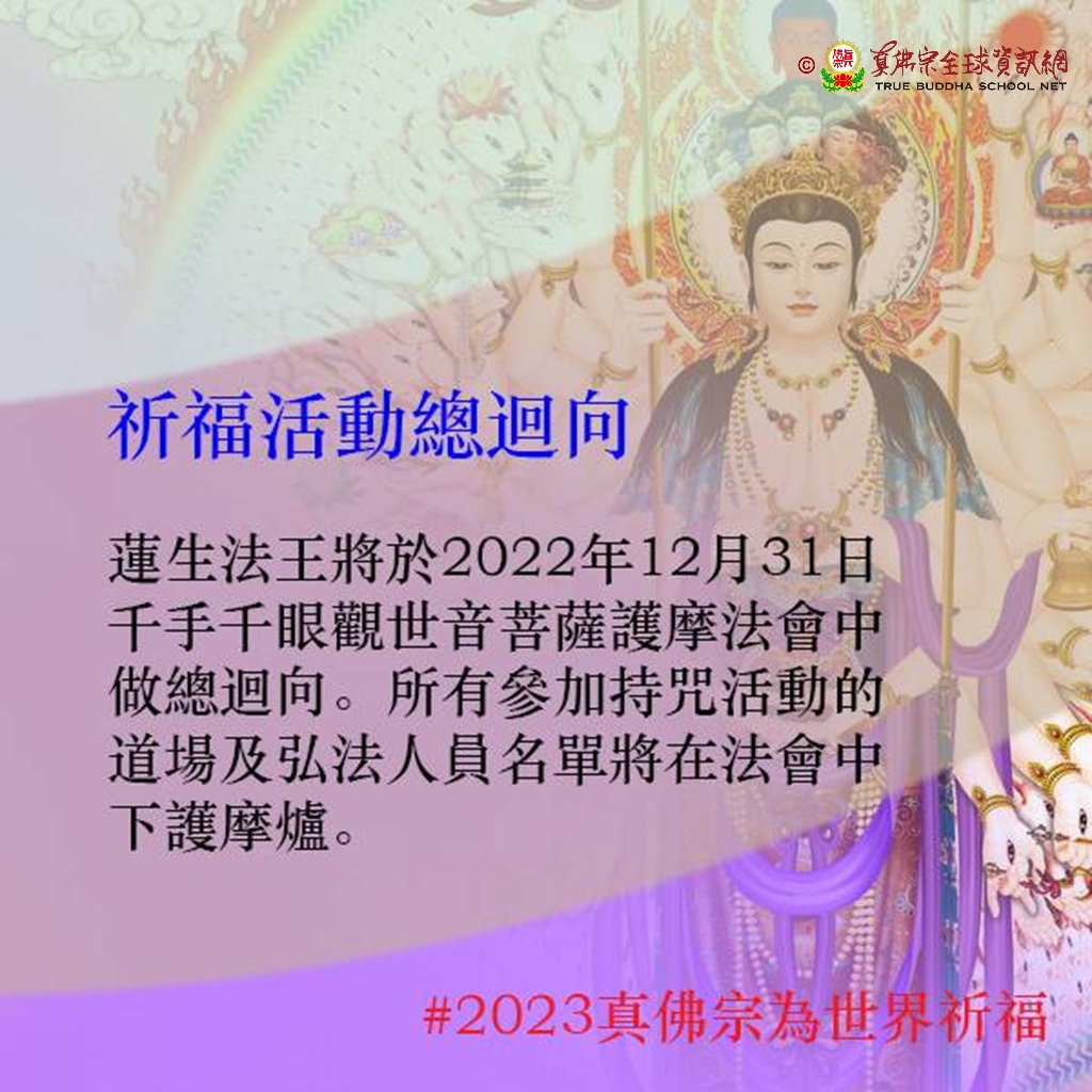 並祈請蓮生法王於2022年12月31日千手千眼觀世音菩薩護摩法會,向聞聲救苦大慈大悲的觀世音菩薩祈求,做總迴向。