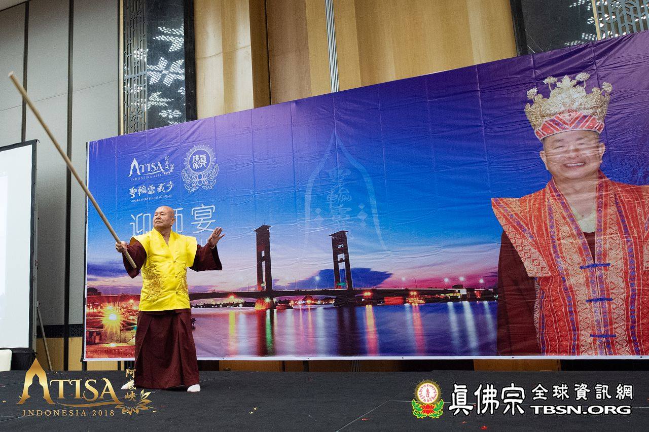 2018年12月11日印尼巨港聖輪雷藏寺迎師宴 【TBSN報導】 2018年12月11日,聖尊一行人抵達印尼巨港。在機場,有聖華堂及聖輪雷藏寺同門來迎師。當晚聖輪雷藏寺設宴歡迎聖尊。除了傳統歌舞,有兩位師姐獻唱了《感恩師尊》及《You Raise me up》,歌聲嘹亮動聽。 聖輪雷藏寺致詞感恩師尊到來印尼傳下阿底峽尊者法,也感謝主辦單位特別安排此行程,讓聖輪雷藏寺也有機會供養聖尊。 聖尊亦以虎虎生威的金剛棍加持弟子們,晚宴在愉悅的氣氛中結束。