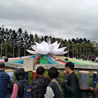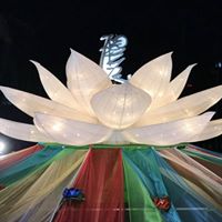 場外有大型裝置藝術「大白蓮花」及蓮生活佛一生著作的兩百多本文集製作成的轉經輪,吸引所有目光。