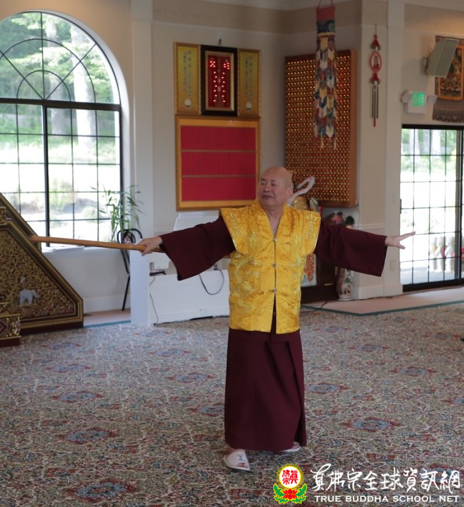 午時至,空中的王者在山莊上現身,兩隻英姿煥發的老鷹(黑鳶),隨熱氣流上升盤旋繞圈,其翱翔飛行姿態,流露自在優雅又威風的王者風範,宛如在展現護法的力與美。不久,熟悉的感應鈴聲響起,眾人期待的主角-法王蓮生活佛盧師尊和師母終於駕臨。一旁的工作人員獻上逞嬌呈美的鮮花,師尊一一領受並供養諸尊。一串白色明亮的珍珠唸珠,掛在師尊胸前,師尊說明如何分辨珍珠的真假,極具專業;一顆顆渾圓、晶瑩剔透的珍珠,恰似法王的如意摩尼寶珠,為大眾帶來光明吉祥。