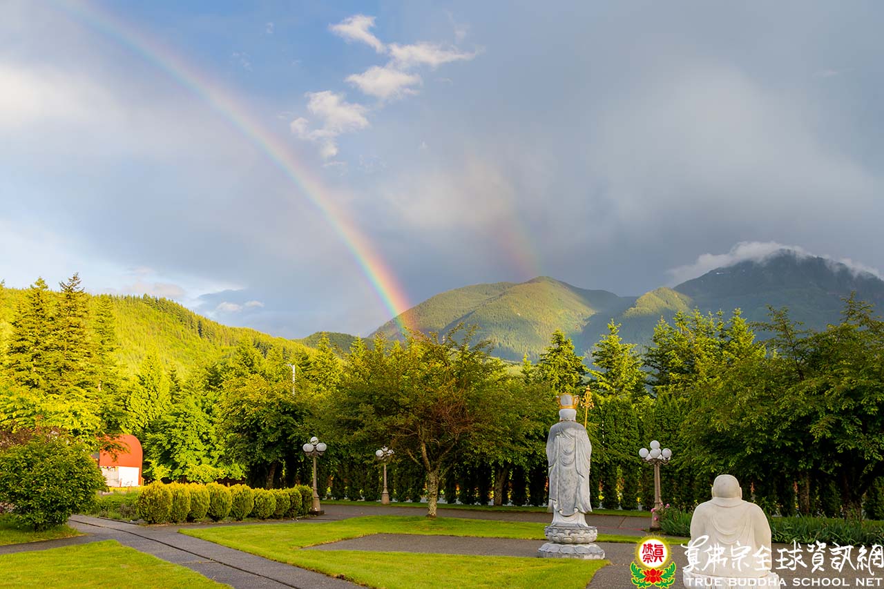 當師尊師母座車離開時,天空不知何時升起了明媚的雙彩虹,當作吉祥的歡送禮,真是名符其實的彩虹雷藏寺!遠望群山連綿不絕,近看芳草青碧,翠林如海;靈秀的山莊,山嵐搖舞,四季如詩,單單今天一日數度換裝,豐富多彩,變幻莫測。再會吧,夢幻般的彩虹,讓我們揮揮手下周再見。