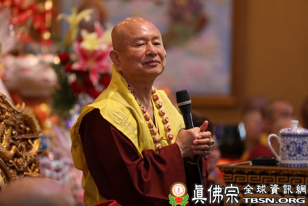 聖尊應邀開示:今天早上自己在飯店,由於窗簾沒有關,致令自己被晨陽照了整個早上,曬成了印尼人的臉,這句話令印尼同門聽了都笑開懷。聖尊覺得華雨雷藏寺十分莊嚴,每尊佛菩薩像都雕刻得很精美,他覺得道場靈氣非常重。此外,聖尊覺得這次大家都非常團結,真是殊勝。