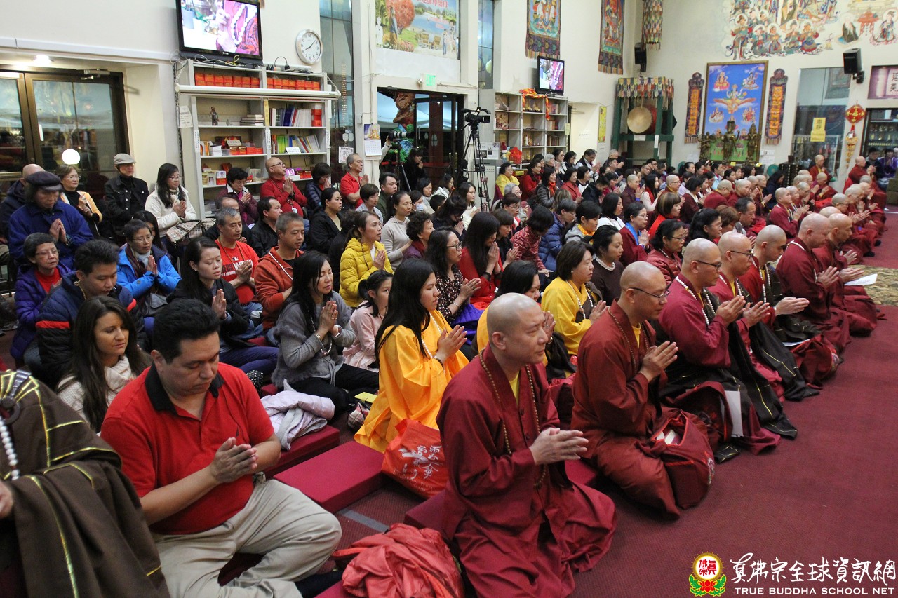 天氣雖然非常寒冷,但弟子們護持聖尊、虔心求法的熱情不減,許多同門仍從世界各地遠來祖廟朝聖。今晚西雅圖雷藏寺的同修主尊是阿彌陀佛。在同修開始前,首先舉行了西雅圖雷藏寺第三十五屆法師研習班結業儀式,本次法師研習班的學員是蓮誰法師、蓮璃法師、蓮唔法師、蓮梁法師、蓮闐法師、蓮卿法師、蓮褐法師、蓮遠法師、蓮唯法師,共九位出家法師,由聖尊頒發結業證書,並且與聖尊合影留念。在眾人的見證之下,隆重的結業儀式禮成,恭喜每一位完成法師研習班的學員,將來都能秉持聖尊的教導,自利利他、自度度他。