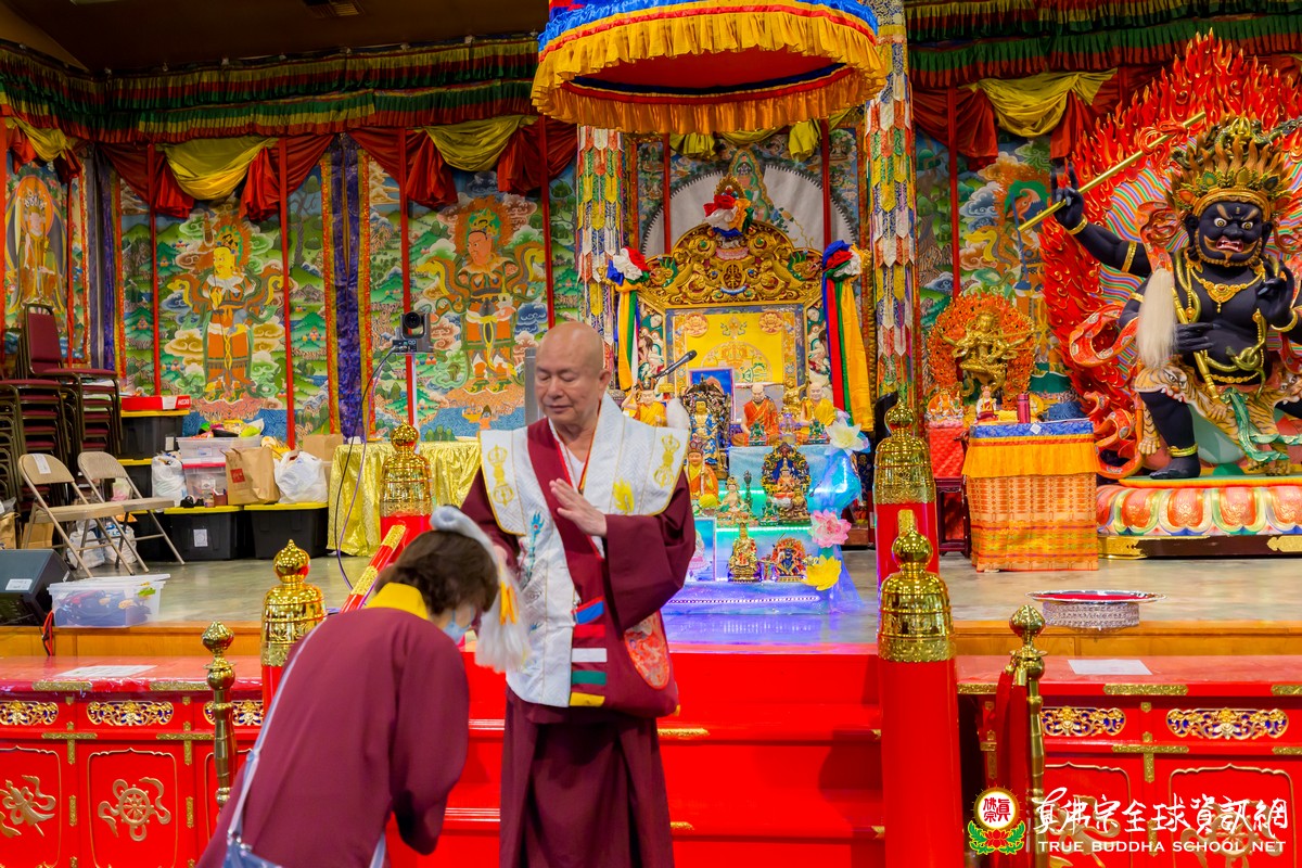 護摩法會進行時,師尊與諸尊合一,演化手印,力量非常強,看不出手臂有任何不適,工作人員也鬆了一口氣。法會後,工作人員準備的供佛表演節目,有堪稱歌王、歌后級的三大卡司,賣力獻唱國語和台語歌曲;一位協助直播的師姐,演唱一首青春洋溢的西洋歌曲,以及一位廟常住唱出曲調高亢悠揚的蒙古語歌曲,反映當地的風土人情;另一位年輕工作人員則大跳韓國美少女熱舞,讓現場熱情上升好幾度。每一位都有近專業水平的演出,皆博得師尊師母大大讚賞。終於等到師尊給大眾加持的壓軸戲,為了讓師尊的手多一些休息,師尊今天不舞拳棍,改開金口唱誦加持大家。熟悉的歌曲,一首接一首,「七朵蓮花」、「荷塘月色」、「陽光和小雨」…... ,每一首都是精彩絕倫,令全場歡呼不斷;師尊動人的歌聲,觸動弟子們的心弦,大家也跟著伴唱起來,師唱徒隨,唱出內心有情有義的天地。