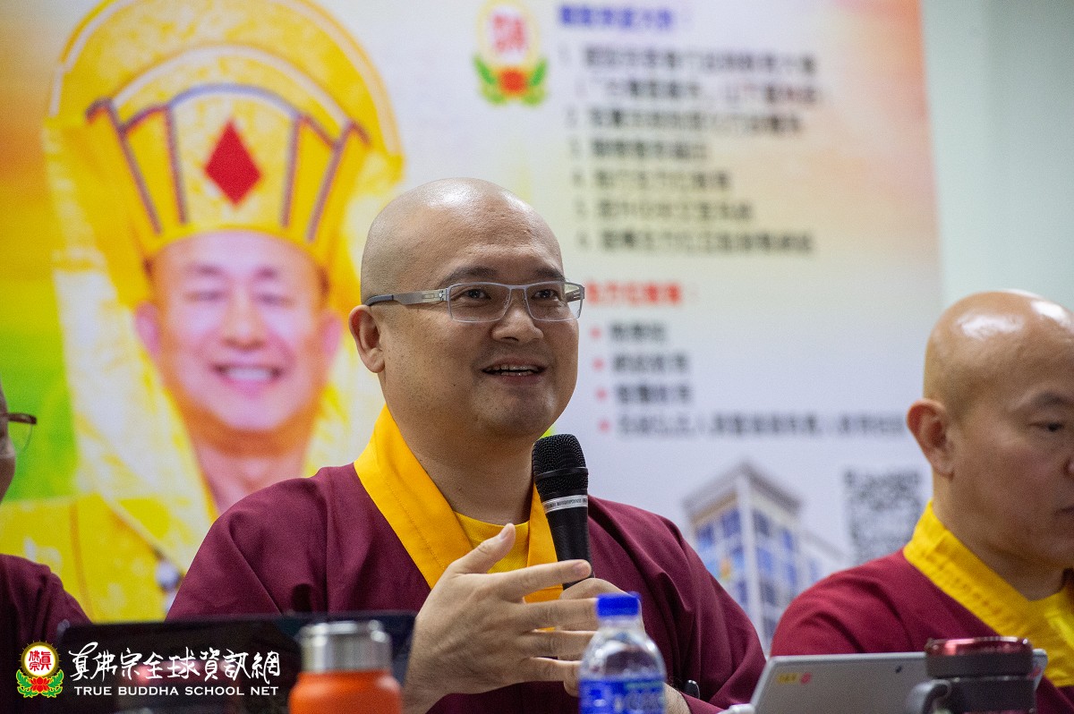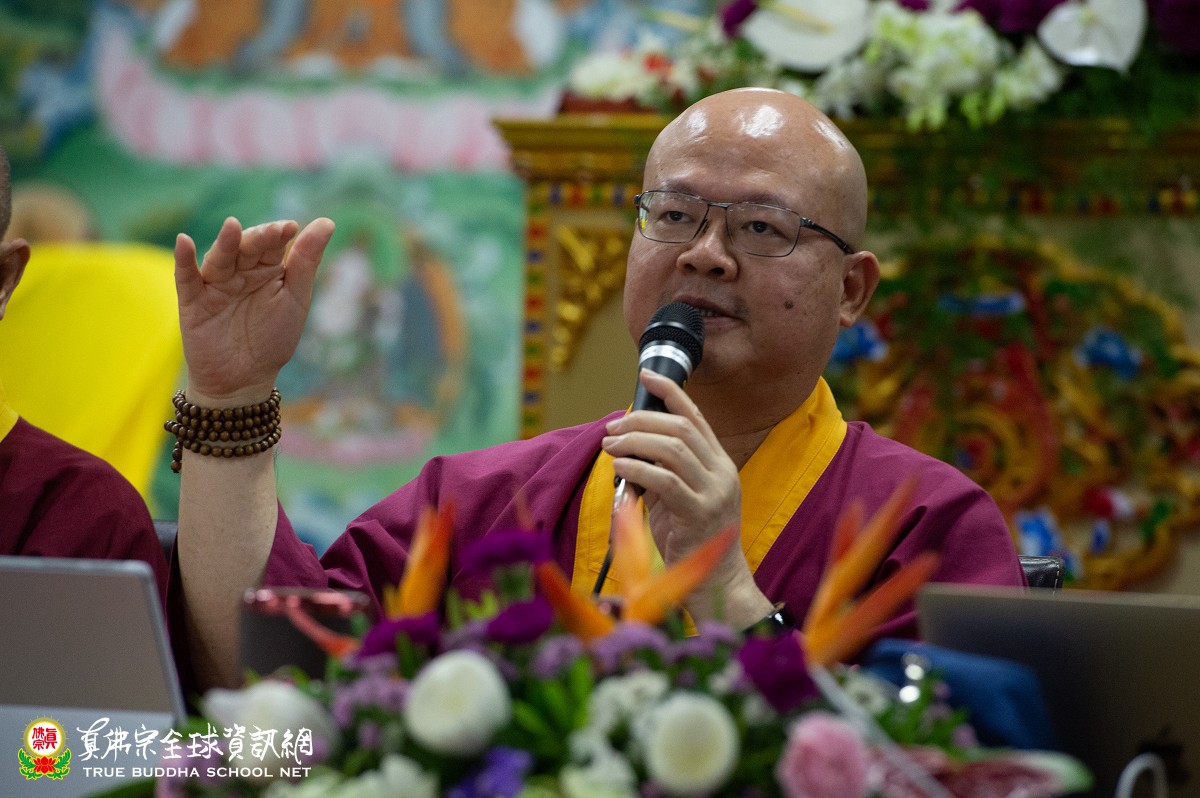 上師期望這些話可以觸動每個人的心。另外,蓮僧上師要蓋西雅圖行政中心。上師期望往後鼓勵所有宗派的各級弘法人員一定要來,要實修實證。他也特別感恩處長們,往往半夜也一起開會、不分日夜的開會,宗委會與在座大家是一體的,宗派一定可以永續傳承下去。