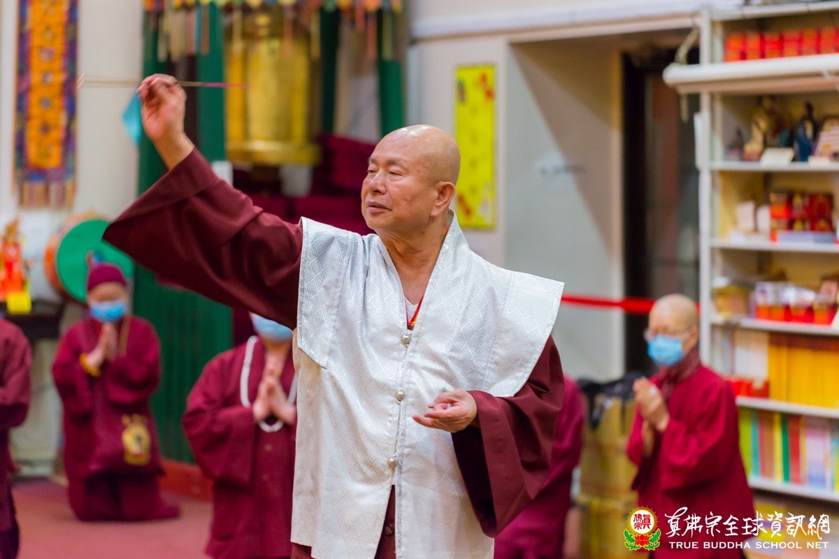 開示結束後,聖尊為新皈依者賜受皈依灌頂,並加持大悲咒水和為佛像開光。會後,聖尊慈悲以拂塵為大家加持賜福。在皎潔的月色中,結束了今晚法喜滿溢的同修會。