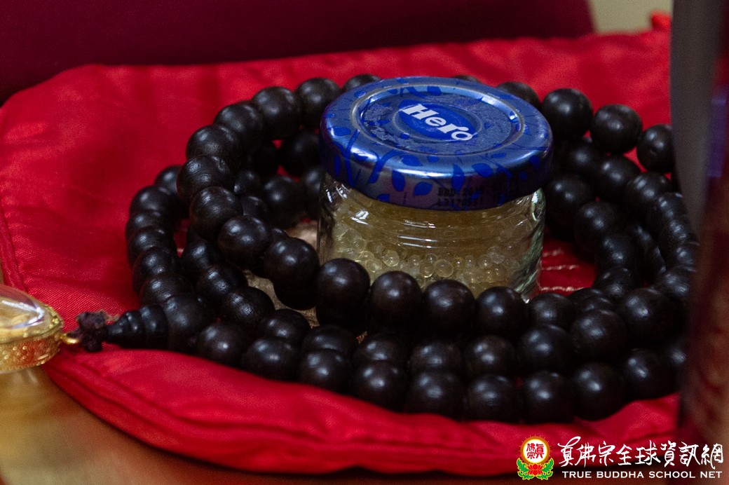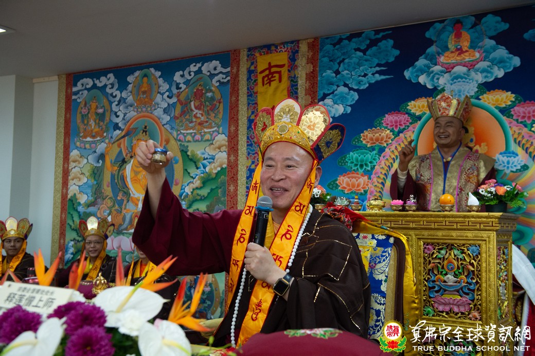 護摩儀軌圓滿結束後,主壇上師釋蓮僧上師給予法語開示,首先上師感謝宗委會與馬密總讓上師有這麼殊勝因緣可以和大家結緣。來法會之前,師尊慈悲要上師向馬來西亞的大家問候。而師尊賜予了金剛舍利為灌頂信物,讓上師以此信物為大家做賜福灌頂。上師請示師尊灌頂要做什麼特別的觀想,師尊教示:觀想五色光代表息增懷誅寶;如果想要敬愛合和、家庭和合的就觀想紅色光、息災的就觀想白色光、想求財的就觀想黃色光等等。