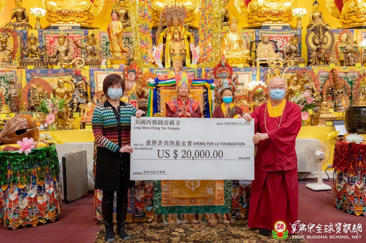 隆重肅穆的秋季法會結束後,西雅圖雷藏寺秉持聖尊蓮生活佛的教導,人溺己溺、自他互換,深刻感受眾生的苦厄災難,特別在今晚的盛會,向盧勝彥佈施基金會捐贈兩萬美元的善款,藉由此次的拋磚引玉,希望有更多人能加入行善佈施的行列,一起來幫助更多需要被關懷的眾生。