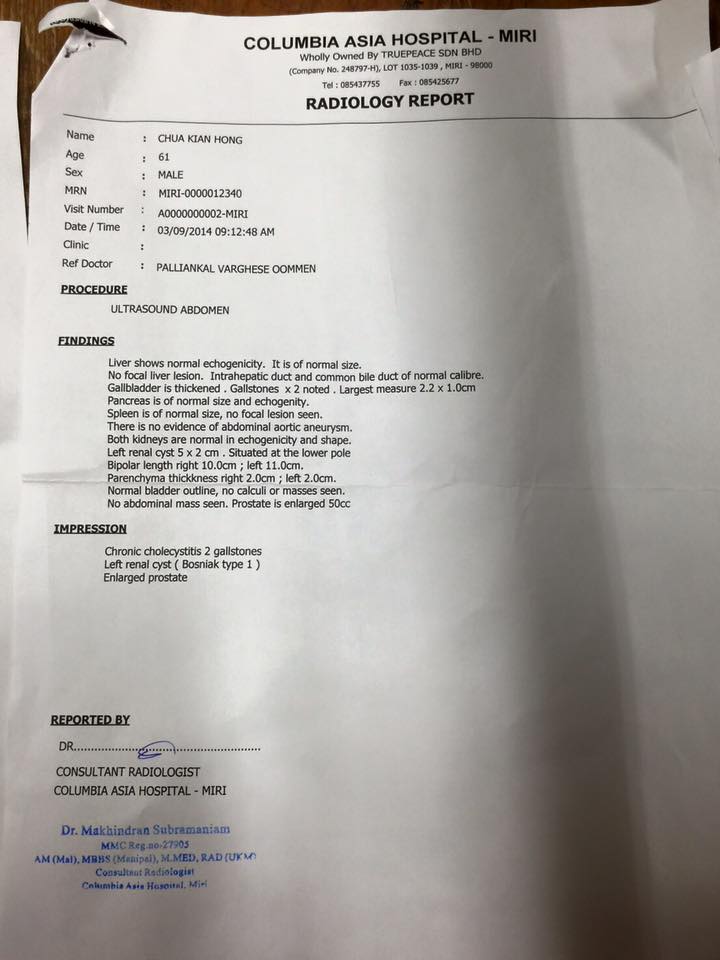 感應連連~蓮生活佛 盧勝彥法王加持弟子後奇蹟感應又一見證! 東馬美里萬法堂主席蔡健煌參加完2/28大幻化網法會後,原本被醫生診斷需要開刀的膽結石,竟奇蹟似的消失! 特地感謝師尊偉大的加持,不可思議! 附件:蔡健煌主席提供的醫院診斷證明。