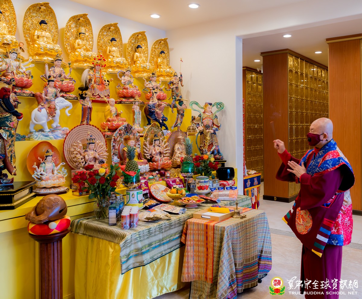 今年,彩虹雷藏寺為了更全方位的服務眾生,在全新的一年,雙蓮境界靈骨塔每一個月份將有白事或紅事誦經法事,以及拜懺法會讓大家報名參加。彩虹雷藏寺今天一早就佈置好莊嚴的壇城,並且擺放了精致豐盛的供品供佛,祈求佛光加被所有的報名眾等。本月首場(雙蓮境界)靈骨塔的白事誦經法事,彩虹雷藏寺也準備無數的蓮花、大量的金紙、冥幣、法船、金紙元寶...等,和擺放各式各樣的供品祭拜報名及安靈在靈骨塔的幽冥眾。師尊到達彩虹雷藏寺時,馬上就前往雙蓮境界靈骨塔為誦經法事的往生位、延生位的壇城做加持開光,並加持所有的供品,也加持所有白事誦經的報名表,超渡幽冥眾等能超拔出苦、離苦得樂、果位增上。
