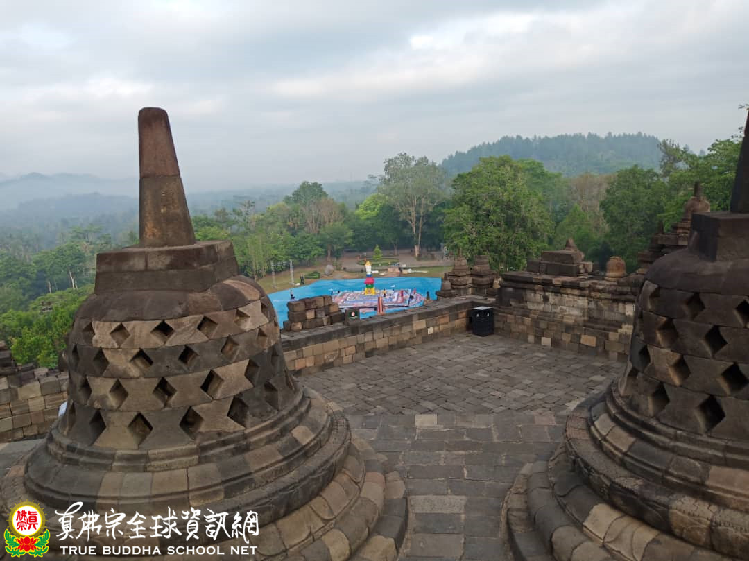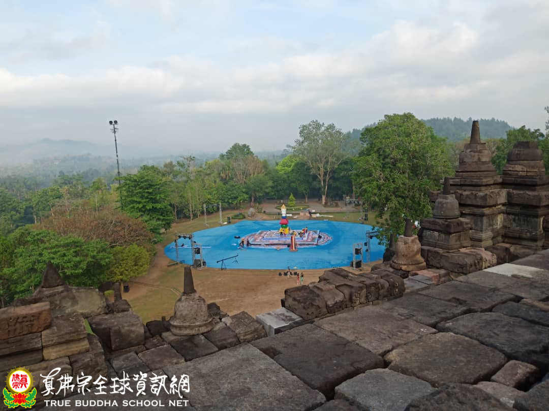 自婆羅浮屠佛塔遙望,真佛宗時輪金剛曼陀羅已完成。真佛宗根本傳承上師蓮生法王聖尊傳下如此珍貴之時輪金剛大法,讓受灌頂的真佛弟子們得以在七世之內成佛,實乃多世修得的福緣!我們感恩根本上師所賜之福份,讓我們得以在印尼婆羅浮屠佛塔聖地,建立時輪金剛曼陀羅,宣揚蓮生法王之偉大成就,與大眾結緣,廣度有緣眾生!