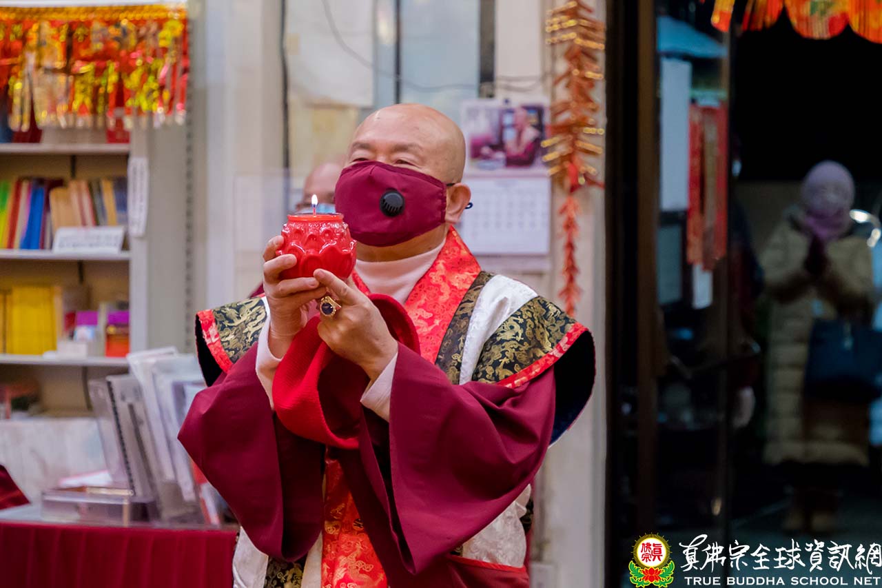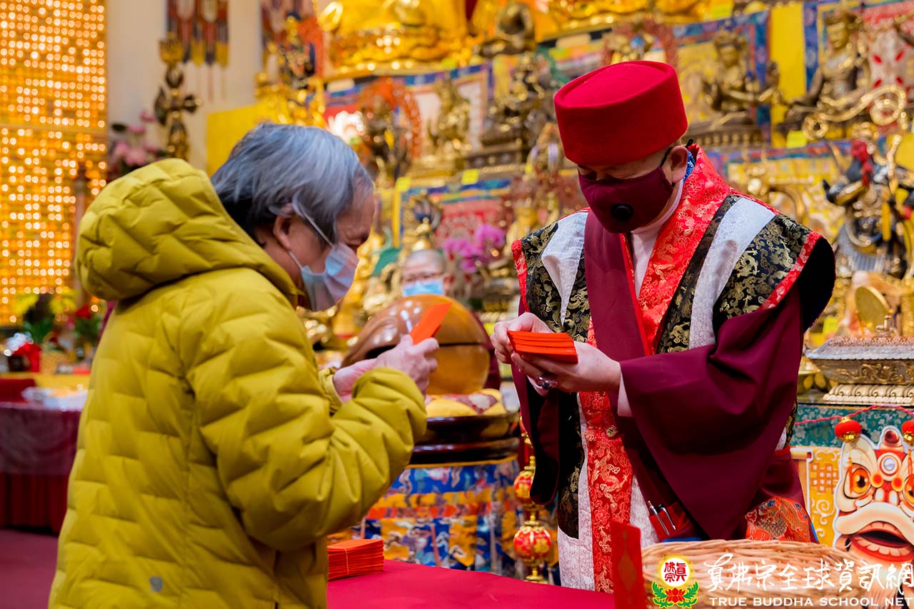 在師尊、師母莊嚴的上香點燈儀式結束後,接下來就是最開心的時候到了。在特別加持了新年紅包後,師尊開始發紅包給大家,弟子們開心的排隊保持安全距離,恭敬的領受師尊給予的賜福。大家熱情的向師尊、師母拜年,師尊、師母也滿臉笑意春風的祝福大家。有了師尊、師母的賜福,相信在未來新的一年,大家都能一切如意圓滿。在每個人都高興的領完紅包後,師尊、師母也準備回家與佛青、佛奇和孫子、孫女一起團圓吃湯圓。