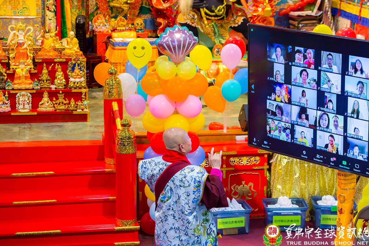 法會後,弟子們慶祝蓮生法王出家三十五週年紀念,法王許願弟子們能身體健康、道心堅固、修行成就。慶祝活動後,法王移駕到Zoom前與弟子們互動,弟子們熱情表達對法王的祝福與想念,法王隨後慈悲加持現場及網路上的所有弟子,並觀賞當天弟子們供養的演出,留下一段美好的回憶。