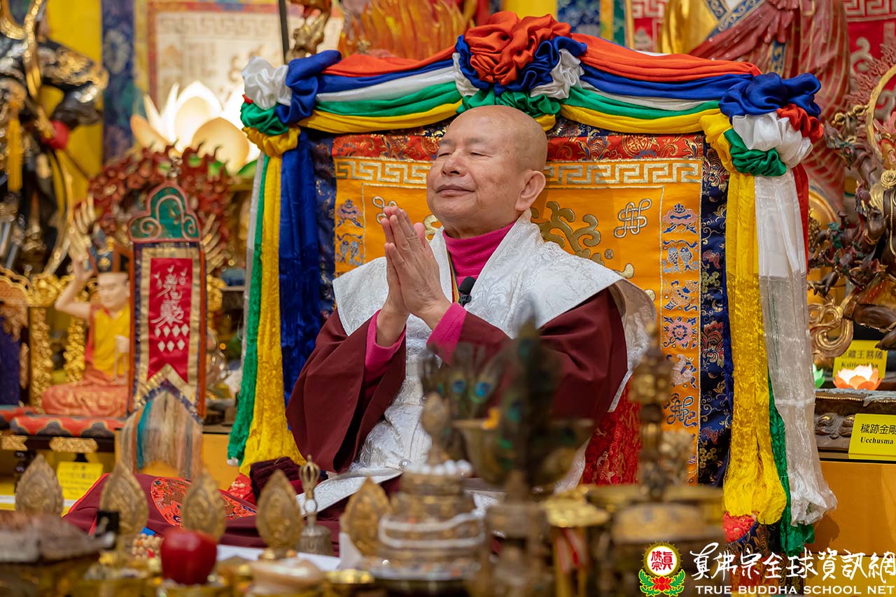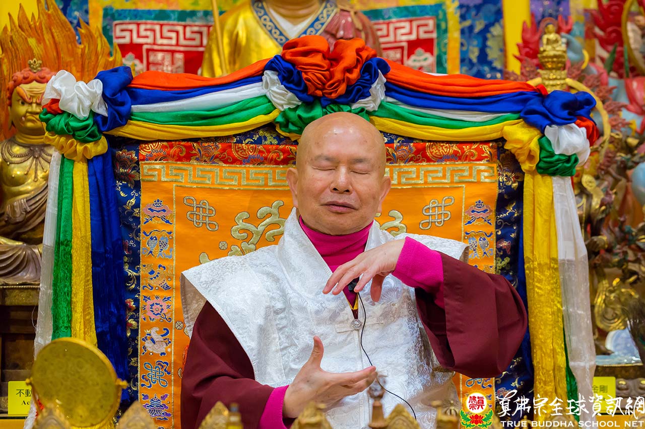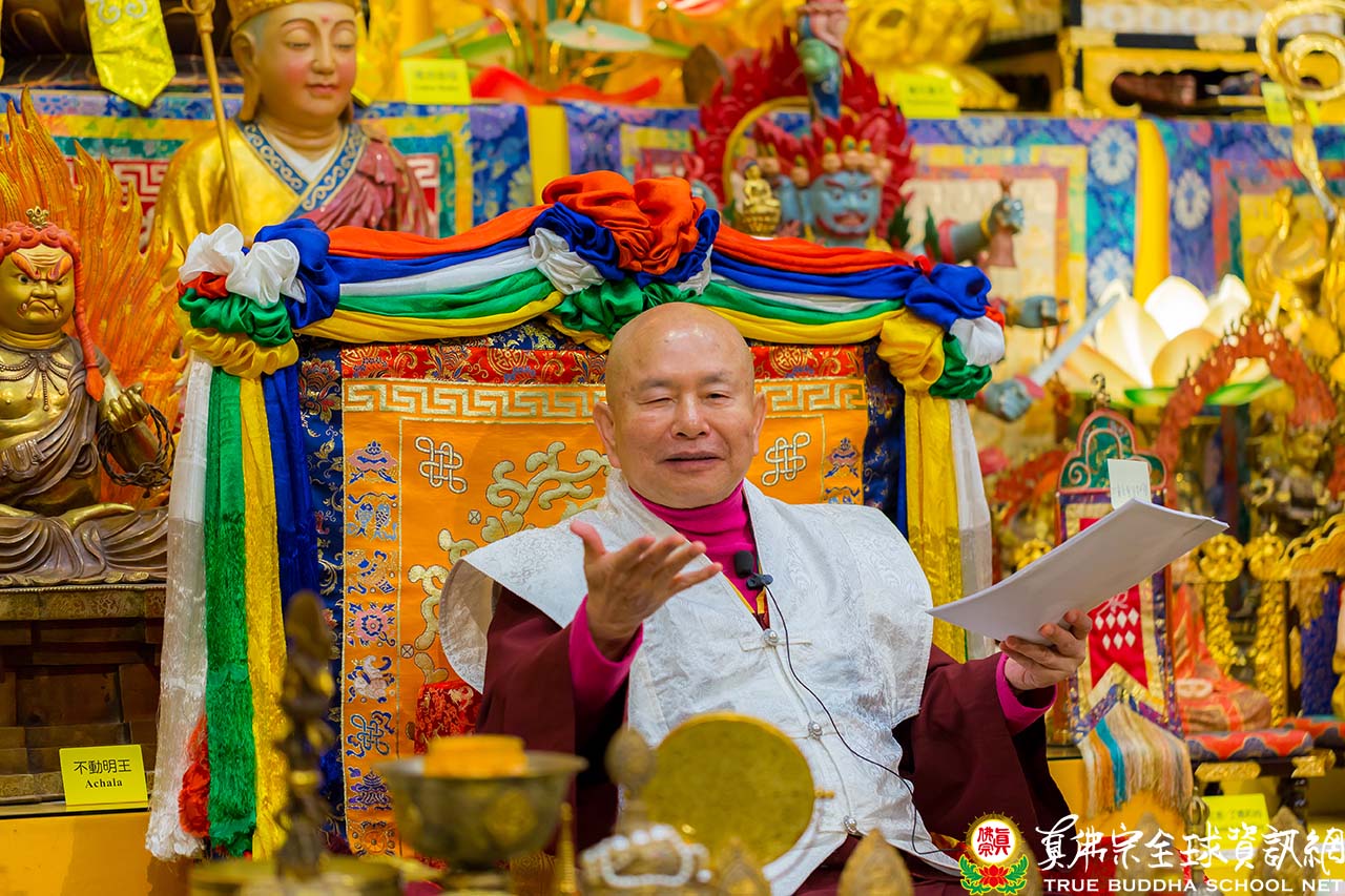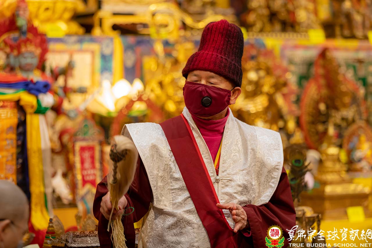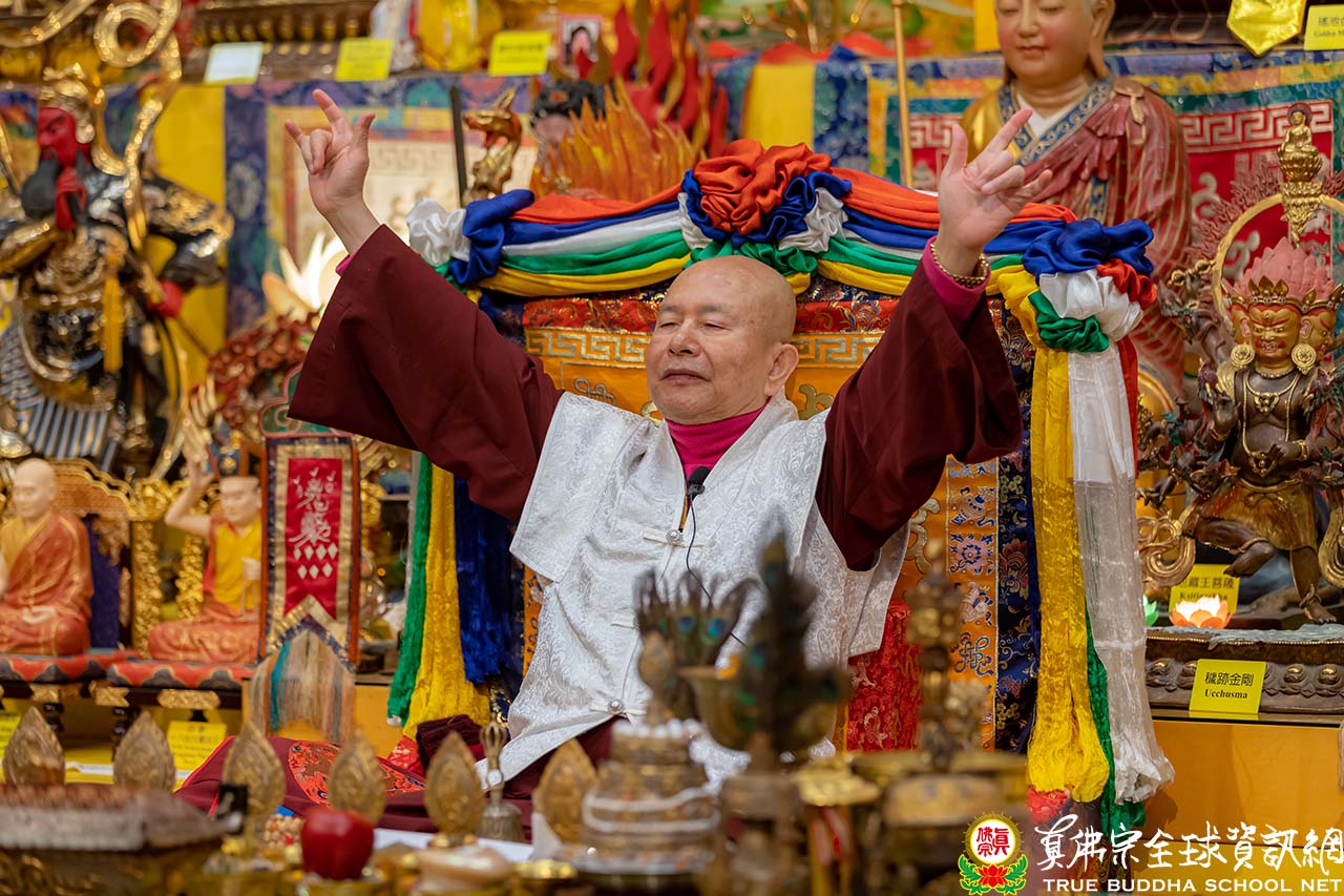 在聽聞聖尊寶貴的法語開示後,聖尊加持大悲咒水和為佛像開光,並以拂塵為大家加持賜福。