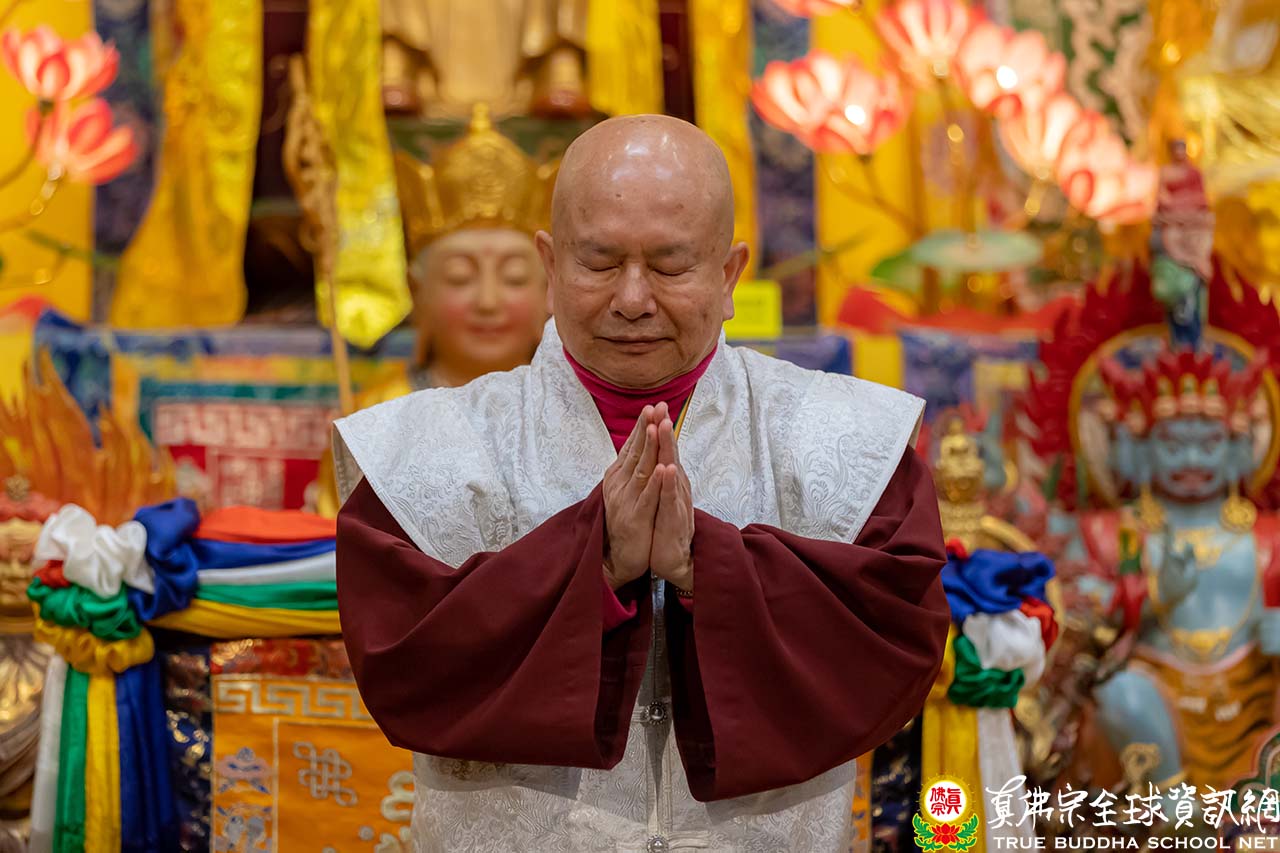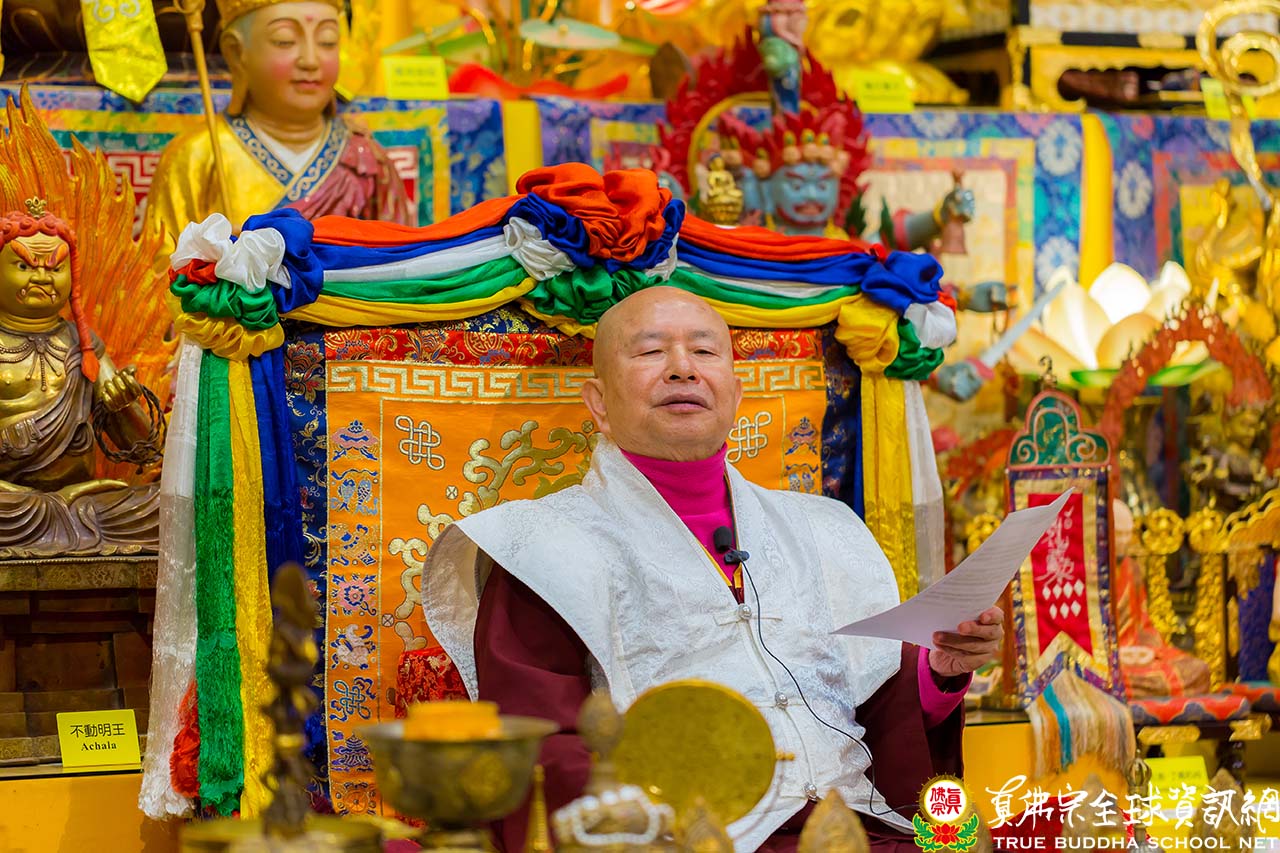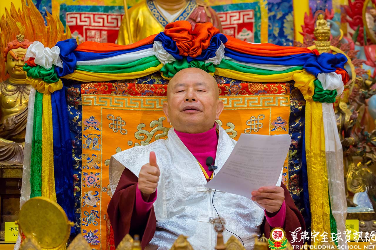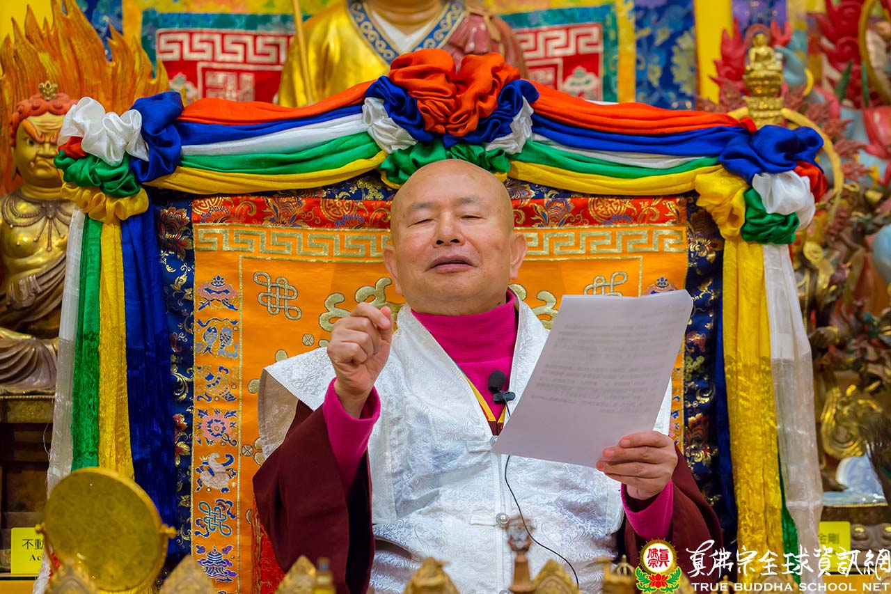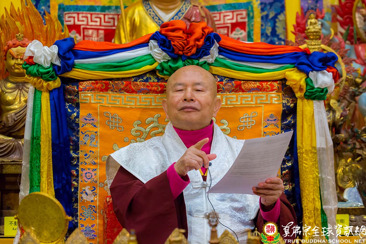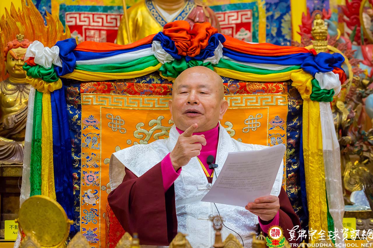 在聽聞聖尊寶貴的法語開示後,聖尊加持大悲咒水和為佛像開光,並以拂塵為大家加持賜福。