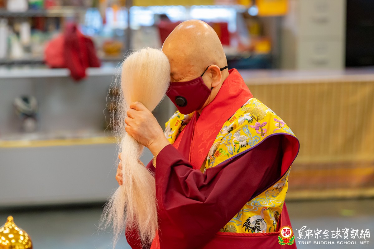 開示完畢後,現場邀請師母一同慶祝母親節。隨即,【魯冰花】及【世上只有媽媽好】的歌曲響起,師母緩緩步向蛋糕前,臉上洋溢著歡喜和悅的笑容。師母一生盡心盡力護持宗派,讓法王弘法路上無後顧之憂,幫助眾生慧命增長,實乃真佛宗之偉大母親。師母先獻花於法王,代表眾生感謝法王賜予慧命;然後法王獻花於師母,感謝師母無怨無悔為宗派全力付出。接著,師母俏皮地與法王合照,再一同與Zoom上弟子道別,法會在和樂溫馨的氛圍下,拉下帷幕。