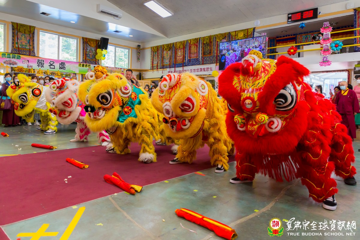 鑼鼓喧天歡樂慶佛誕,祥獅獻樂雙雙來報喜。歡天喜地的鑼鼓聲把全場的氣氛再次帶入高潮,五隻威猛又可愛的獅子,搖頭擺尾來助興,讓大家掌聲連連。