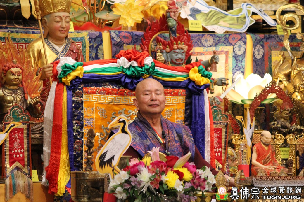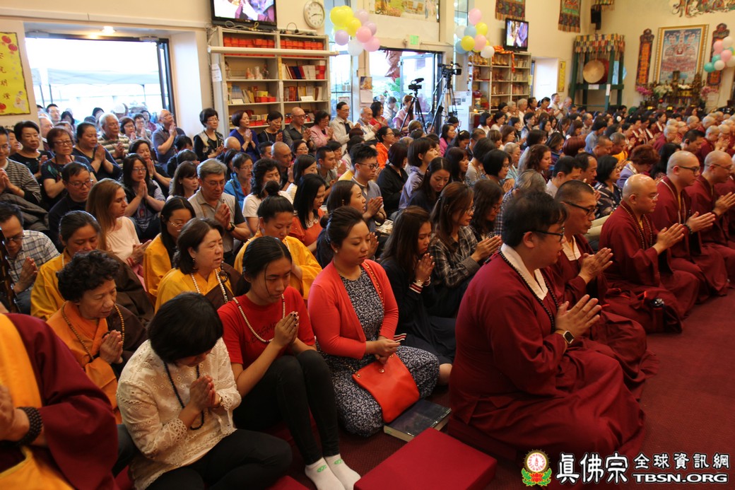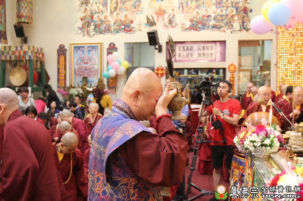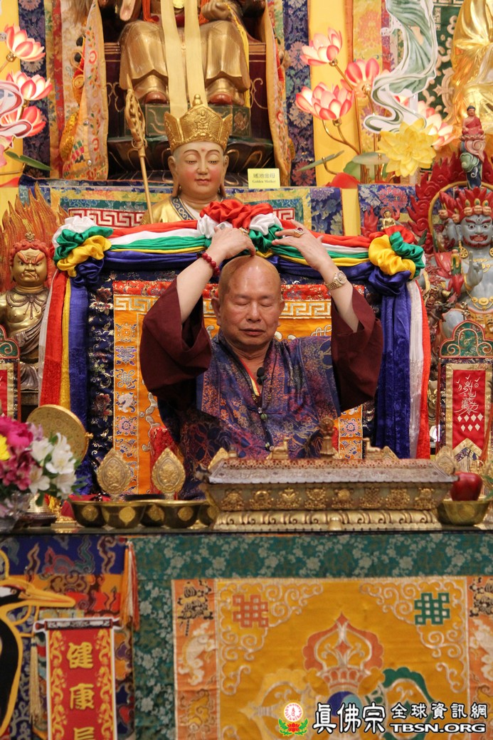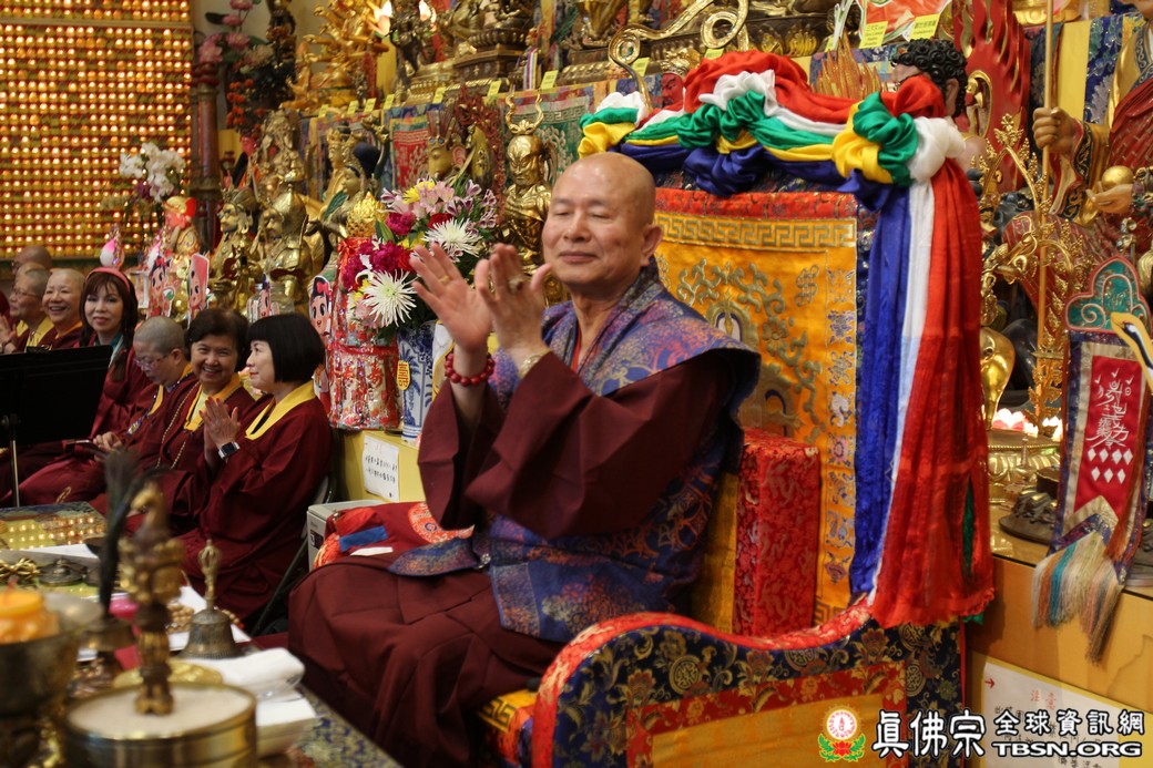 在精闢的開示後,雷藏寺唱誦組帶領大眾唱誦阿彌陀佛聖號。會後,聖尊為求皈依的信眾賜受灌頂,並加持大悲咒水、開光佛像。最後祖廟推出大型的生日蛋糕慶賀聖尊的生日,大家一遍又一遍的齊聲歡唱不同語言的生日快樂歌,聖尊與師母一起切蛋糕,滿堂的掌聲、喝采聲不絕於耳,無論是現場或是收看網路直播的同門,全世界的弟子都誠心的對根本上師獻上滿滿的祝福。