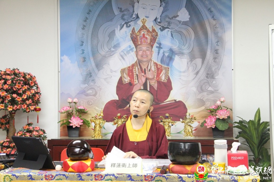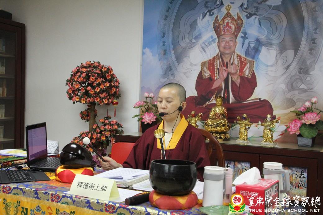 午餐時間結束。下午1時30分,上師繼續與大家分享如何帶領同修及法會儀軌的要點。上師在這個環節亦特別的播放根本上師親口念誦的咒音音檔(修法儀軌),旨在教導大家如何正確的發音與念誦[往生咒]、[觀空咒]、[八大本尊心咒]、[百字明咒]等。