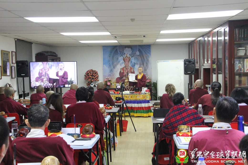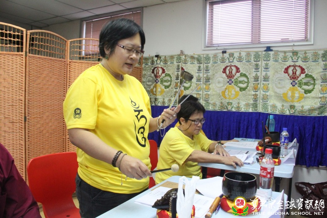 午餐時間結束。下午1時30分,上師繼續教導學員們學習唱誦與法器使用。尤其是教導大家如何正確的跟著節拍唱誦佛前大供與地藏王菩薩聖號(焰口:二音轉六音)。在上師的緊盯下,每個學員輪流唱誦起音。