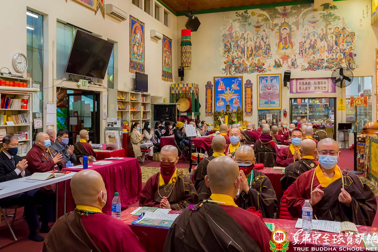 本次前來參加白事誦經的弘法人員及同門約近百人。白事誦經是由彩虹雷藏寺住持釋蓮彥上師擔任維那帶領大家唱誦。莊嚴肅穆的梵唄響起,以近五十位僧眾誦經超度的功德力及所有參加同門的虔心迴向,希望蓮印上師得到根本上師的超渡接引,能離苦得樂、蓮品增上。