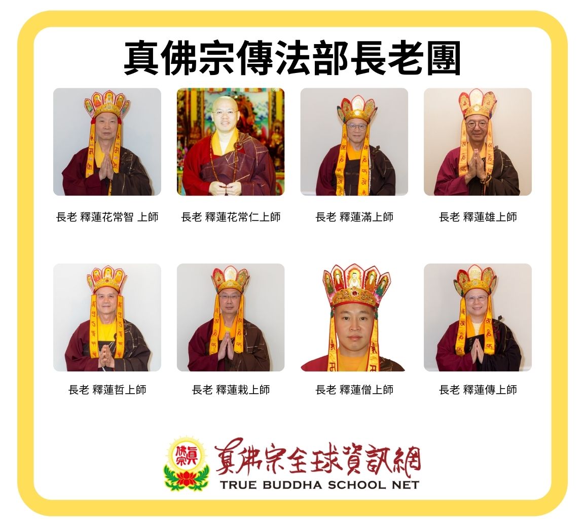 本宗第一批由聖尊蓮生活佛親封的八位長老分別是:長老 釋蓮花常智 上師、長老 釋蓮花常仁上師、長老 釋蓮滿上師、長老 釋蓮雄上師、長老 釋蓮哲上師、長老 釋蓮栽上師、長老 釋蓮僧上師、長老 釋蓮傳上師。此八位長老皆是早年出家並擔任上師護持聖尊多年、佛學淵博且為宗派貢獻良多的本宗楷模,足為擔負守護弘揚本宗法統與傳承領頭羊的重責。