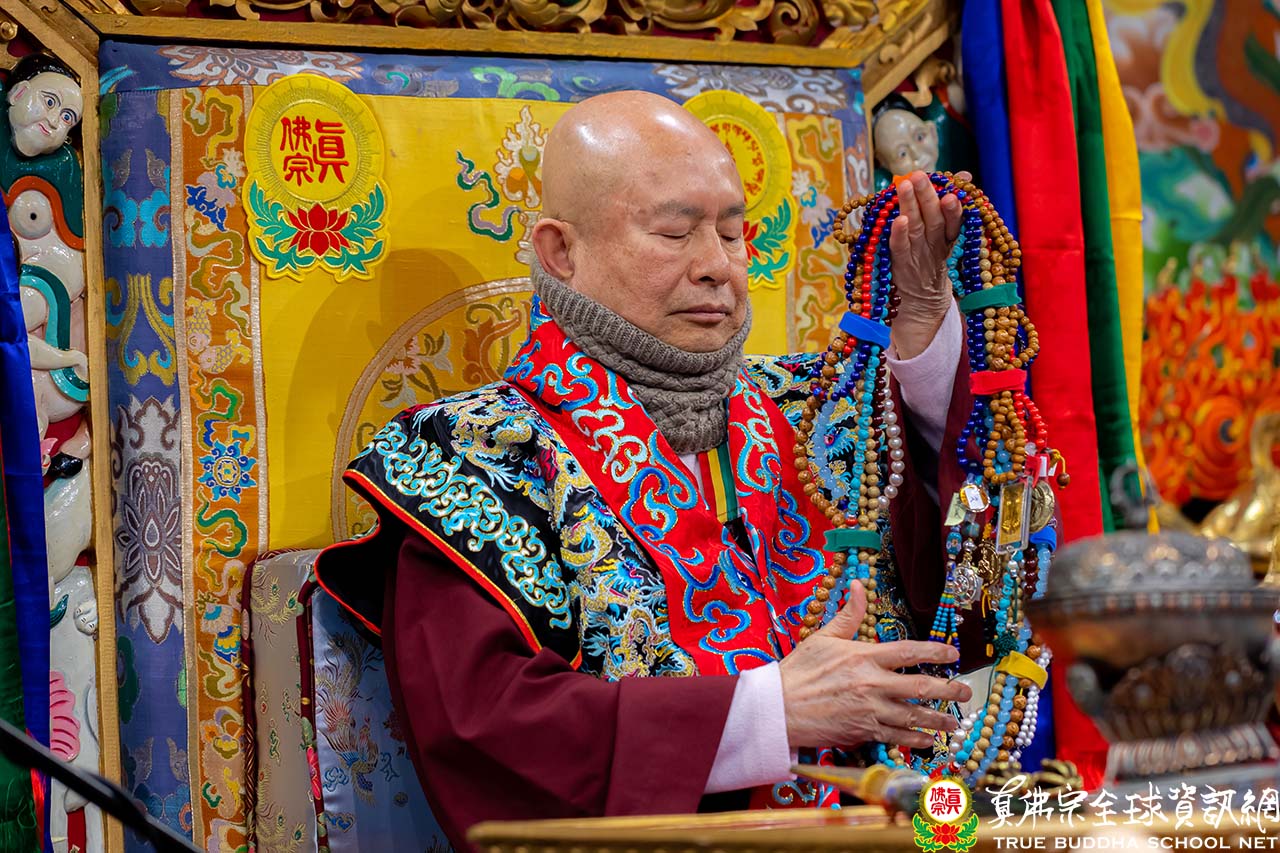 法王表示,今天的主尊「大力金剛」威靈顯赫,只要一比手印,馬上就下降,是真佛宗特聘的大護法。拂塵代表瑤池金母,金剛棍代表蓮花童子,頂上是阿彌陀佛。其本身就是地藏菩薩六侍者中的大力侍者,所以是瑤池金母、阿彌陀佛、地藏菩薩、大力侍者和蓮花童子,五合一的大護法金剛神;持棍可以打暈怨敵,持索可以捆綁怨敵,拂塵可以消除業障,手結期克印表示降伏一切,是故威力無窮。法王說,希望以後同門都要護持大力金剛法會,因爲祂是真佛宗的特聘大護法。法王指出,其右手的大拇指上,就有大力侍者的標志,是地藏菩薩請祂來護持真佛宗的。