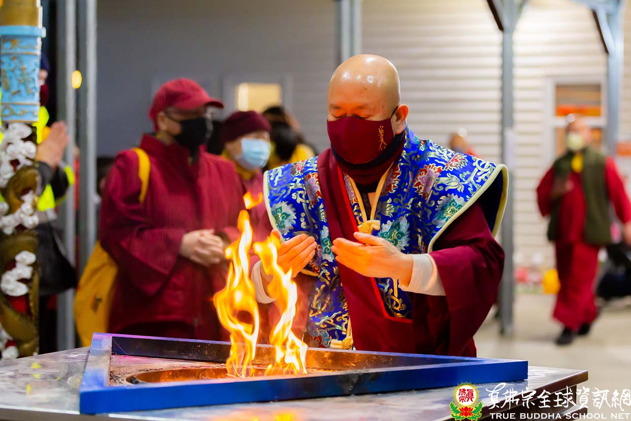 2022年2月6日大年初六,大家都沉浸在歡慶農曆新年的喜悅之中。這一天,美國西雅圖彩虹雷藏寺恭迎聖尊蓮生法王主壇虎頭金剛護摩法會。法王抵達雷藏寺後,先帶領大眾頂禮壇城,然後移駕至Zoom屏幕前與世界各地的弟子互相問安。弟子們紛紛向法王祝賀新年快樂,氣氛其樂融融。恭請法王上法座後,農曆新年的第一場護摩法會正式開始。