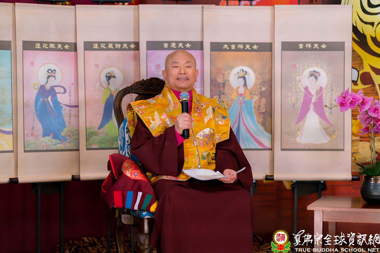 另外呢,還有所謂的長壽天,這個在密教裡面,都非常重要的。尤其是十二吉祥天,因為在新的一年,希望帶給大家吉祥的、好的,就是十二吉祥天女。她是可以納福、消災、可以驅邪,尤其是在密教。密教的十二吉祥天女,又是守護神,也是可以講起來,她可以驅邪。密教的吉祥天女像,跟我們中土的吉祥天女的像,是不一樣有所不同的地方。她不但可以納福、消災、驅邪,也可以化解誤會及業力於一身。這個就是功德,舉凡對佛恭敬、如法供養、跟持天女名號者,他都會受到無上的快樂。我們懂得佛經裡面,也有《吉祥天女功德品—佛說吉祥天》,有這一品在佛經裡面。」