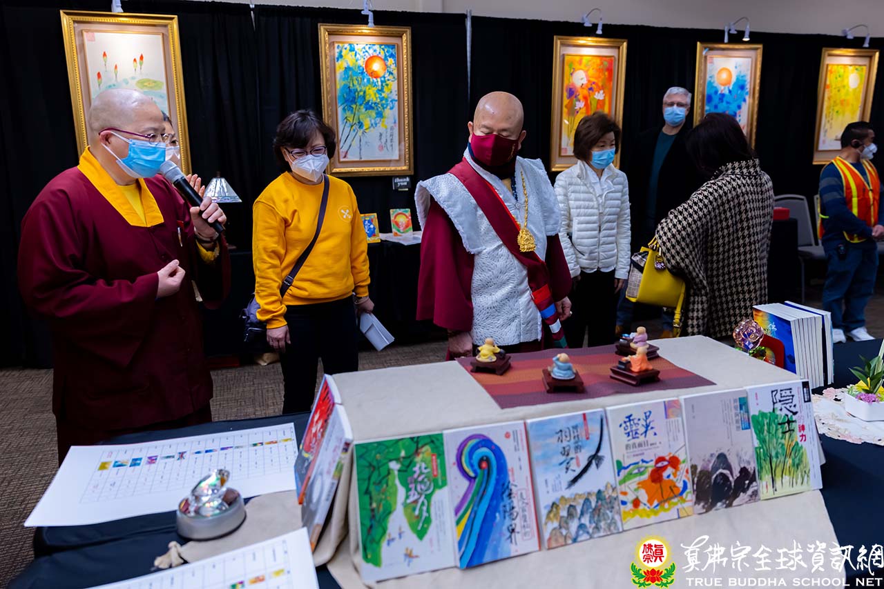是日下午近兩點時,弟子們恭敬頂禮並以熱烈掌聲迎接法王聖尊蓮生活佛蒞臨法會現場。聖尊加持往生位、延生位以及大悲咒水,接著參觀由真佛般若藏設置的「曙光藝術畫展」。聖尊筆墨弘法52年,文章畫作富含智慧與加持,慈佑眾生。當日展出部分珍藏墨寶畫作及以畫作翻新封面之著作文集,幅幅皆引人入勝,令人大飽眼福。宗委會亦設有功德總會十二吉祥天女贊助方案的攤位,十二吉祥天女具有種種殊勝功德,此套精品更特以聖尊的髮舍利摻入天女髮際。聖尊一一參觀各個攤位,慈悲賜予加持。
