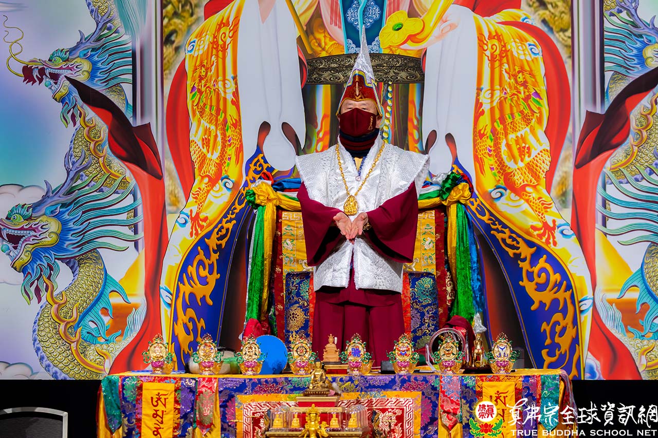 大眾虔心合掌唱誦蓮花童子心咒,莊嚴的迎師隊伍手持法器、佛幡,以鮮花撒地迎請真佛宗創辦人—法王聖尊蓮生活佛昇登法座傳授密法。