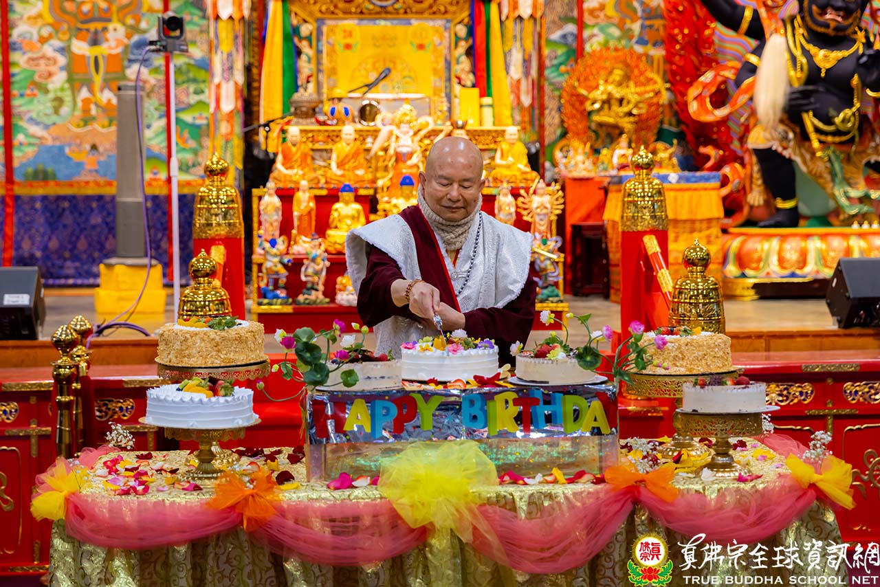 法會後,彩虹雷藏寺為法王準備了精美的蛋糕慶祝這個美好的日子,彩虹雷藏寺代表也獻上了美麗的鮮花及供養。之後大家又以一曲「感恩師尊」用手語的表達來呈現對聖尊的感恩。這首歌深深的打動了法王以及現場及網路、zoom線上的所有弟子,大家沉浸在這幸福的氣氛中留下了感動的淚水。儘管弟子們都在努力的學習「過去心不可得,現在心不可得,未來心不可得」,但還是祈願此時此刻的美好,留在弟子們的記憶中天長地久。最後,法王為現場的弟子們做了蓮花童子灌頂,法會在無限的感動及喜悅中圓滿落幕。
