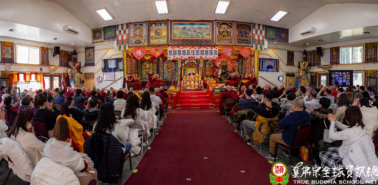 護摩結束後,請佛住世的點燈儀式開始,由宗委會、彩虹雷藏寺、西雅圖雷藏寺代表敬獻哈達及供養以表最崇高的敬意,全體弟子長跪合掌,司儀以動人的聲音說出了弟子們的心聲:法王是明燈照亮了世間、照亮了弟子們的慧命,是世間最溫暖慈悲的撫慰,是夜空中最明亮的星,指引眾生開悟得解脫。法王的大日光明點亮了弟子們心裡的那一盞燈,弟子們願以一己的螢燭之光,齊聚成為皓月之明,祈願這希望的光明能照見弟子們再三的請佛住世之心。