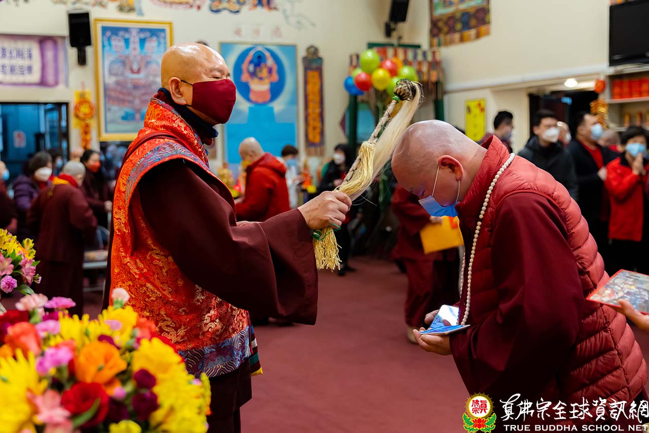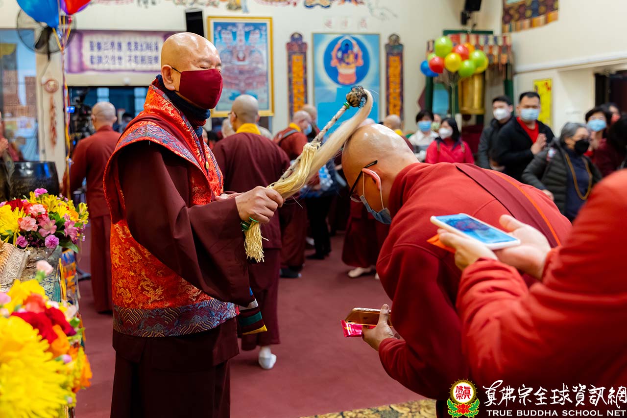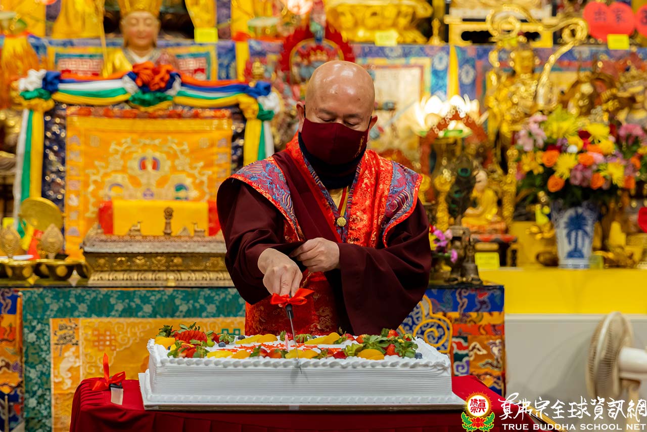 聖尊彌足珍貴的金剛經講釋結束後,慈悲為新皈依弟子做皈依灌頂,並加持大悲咒水、開光佛像、加持眾弟子。祖廟特別準備了大蛋糕慶祝聖尊出家三十六周年紀念,在充滿感恩的祝賀歌聲中,聖尊吹蠟燭、切蛋糕。因為有聖尊的誓願度眾生,才有今天真佛宗的五百萬弟子。祝願聖尊佛體康泰長住世,常樂自在度眾生!