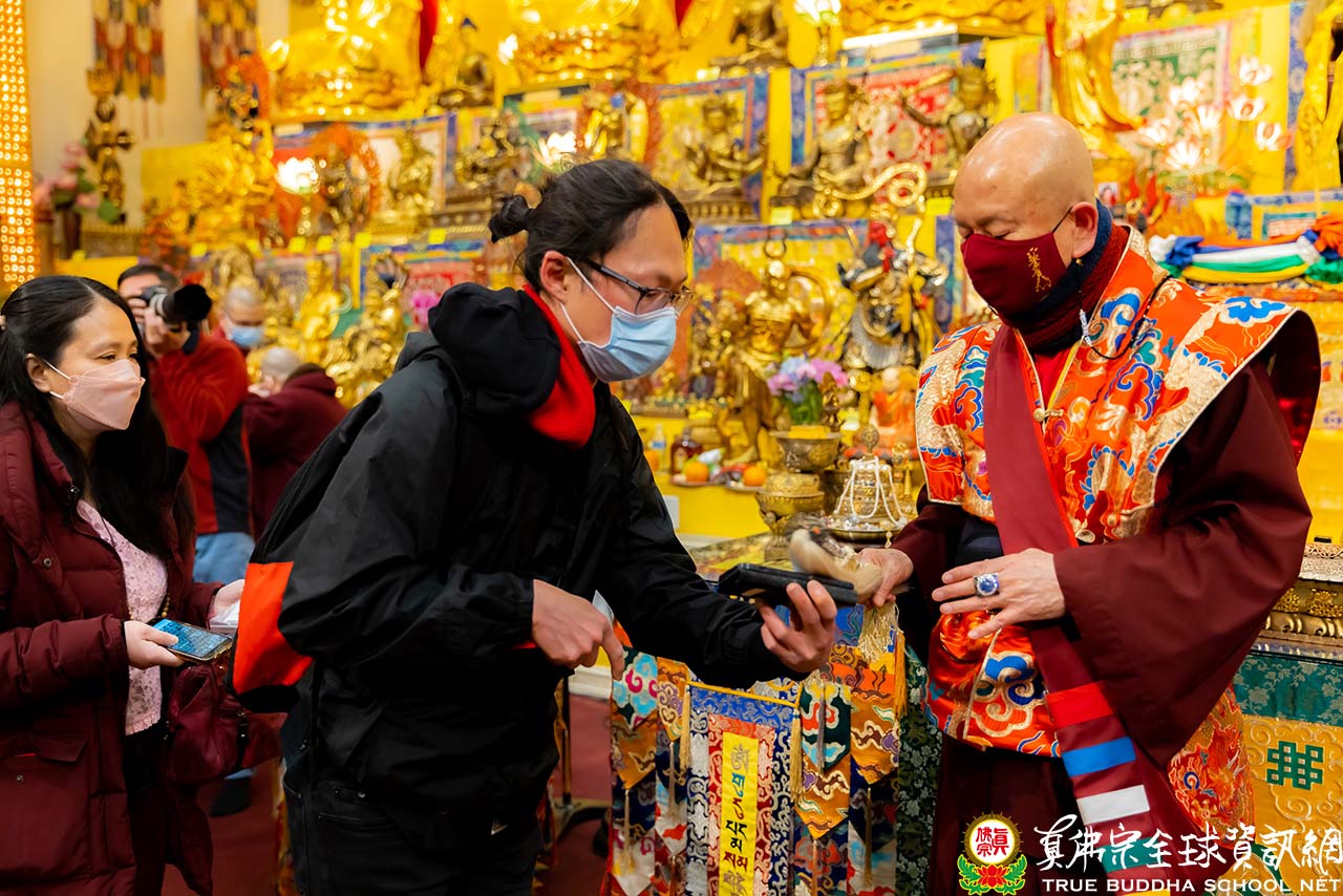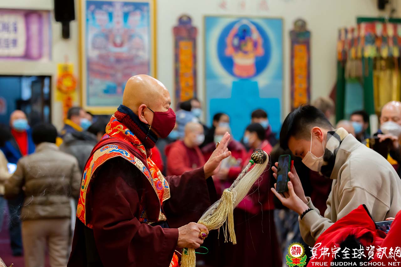 精彩寶貴的法語開示後,聖尊蓮生活佛慈悲賜授新同門皈依灌頂、加持大悲咒水暨開光佛像,並以拂塵一一加持眾人。真佛弟子因根本上師的啟發才能明白真實佛法,聖尊不僅是我們的大善知識,更是光明的來源,如此殊勝的蓮花童子因緣,應當把握今生實踐敬師、重法、實修。