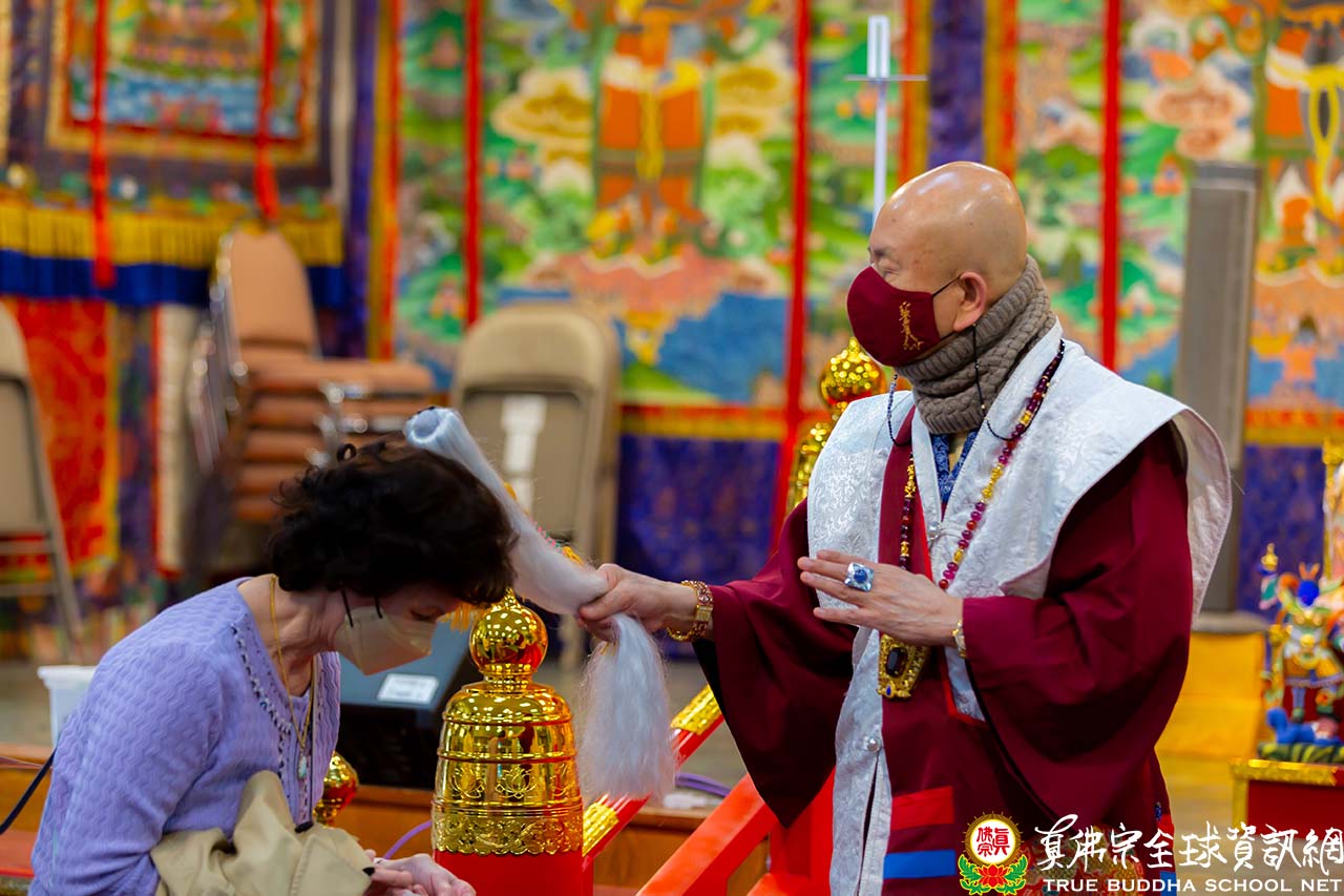因為今天是尊勝佛母的護摩法會,法王當場請示了尊勝佛母,而答案是:有的可以、有的不可以。法王從中悟到,很多事情都是如此,例如疫情前有位弟子,從印尼飛到西雅圖求加持,因摩頂而消除了腫瘤。也有人,並非弟子,只是經過法會現場聽到大幻化網金剛的咒語,而得到加持,全身發熱,腫瘤就消失了。可也不是所有的人都會好,這是同樣的道理。會不會好,要看因緣。所以,這不是一個有記載的密法,但是這位弟子可以做,代表著她的孝心,最後好與不好,還要看因緣。