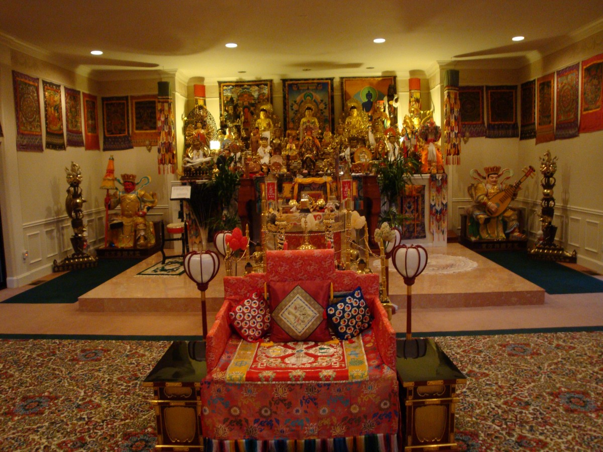 一:在密壇中,有一法座,是古木雕刻成法王的寶座,上舖有西藏法王的十字金剛杵唐卡,又舖有西藏紅花的唐卡靠背,又華麗又莊嚴,色彩濃豔。此法座是古董,歷經數百年,雕刻風格古樸活潑,絕大部份完好無損,木頭仍然牢固。這法王寶座正是黃教六大寺住持,黃教大活佛「嗡.恰克」活佛所贈與的。