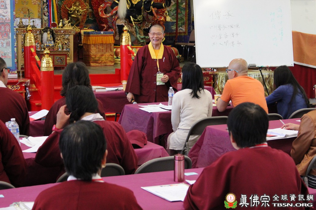 17日上午9時,中英文同步翻譯的培訓課由會長蓮花程祖上師致歡迎詞後正式開始。各位授課的上師為了幫助應考生掌握教材重點,順利通過筆試、面試、梵唄考試成為合格的講師助教,可謂傾囊相授毫無保留給予應考生們最大的支持!上師們以不同的實例及各種寶貴的經驗分享,非常詳細地向應考生講解了講師助教應具備的學佛正念、守戒律的重要、隨時可以向他人介紹根本傳承上師聖尊蓮生活佛的修持成就的經歷、真佛宗的傳承、真佛密法的殊勝、日後在法務時遇到的實際狀況該如何正確應對、成為講師助教如何主持同修、主持法事及梵唄唱誦的技巧要點。