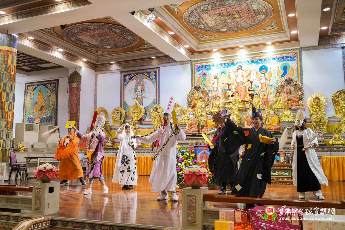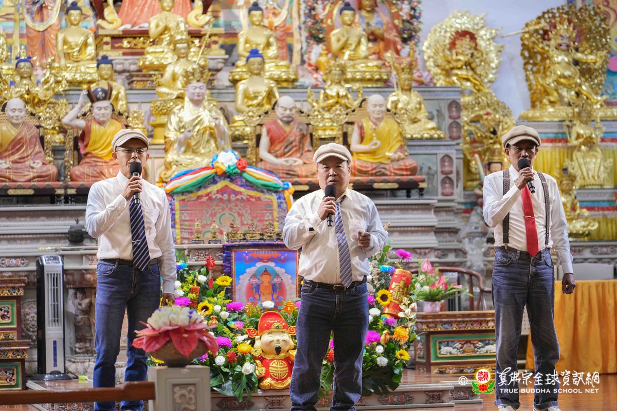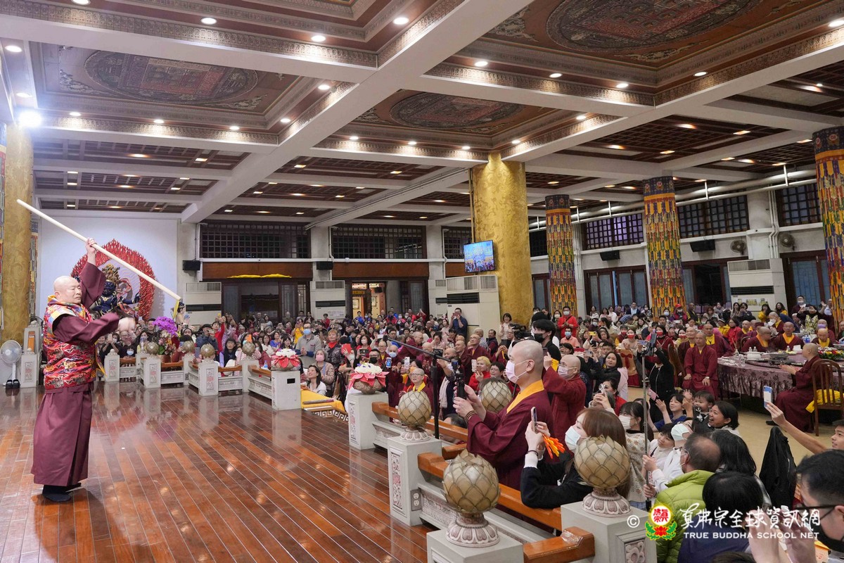 師尊在用餐期間還巡視各桌,也以吉祥鼓、金剛棍表演加持大家!台灣雷藏寺更特別準備精彩的年節之節目,由蓮花素任助教與豆豆師姐主持!現場氣氛非常的溫馨熱烈!